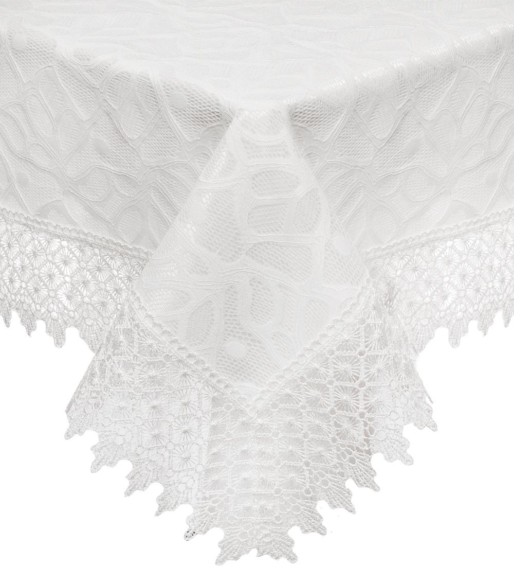 Скатерть белая банкетная квадратная. На непрозрачной основе лежит гипюр, по краю белое воздушное кружево.