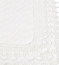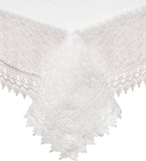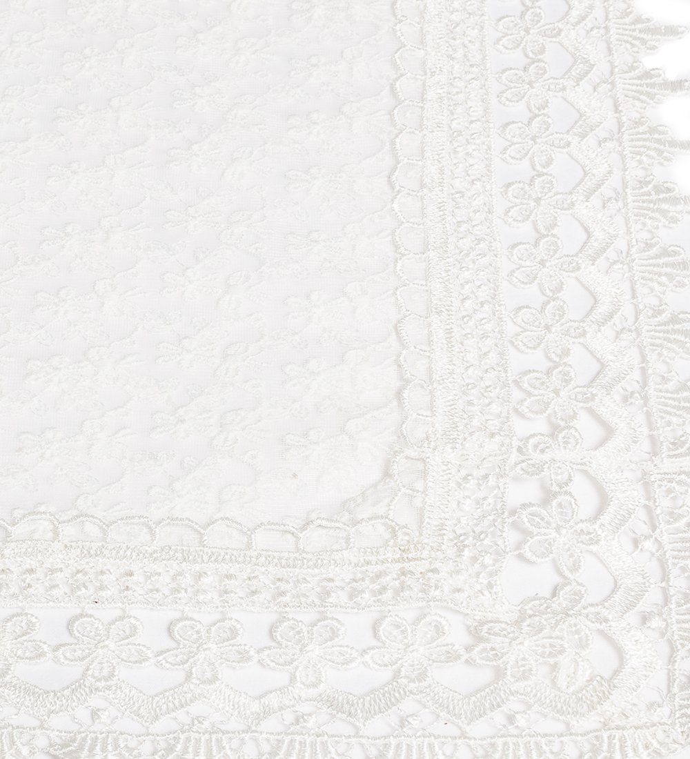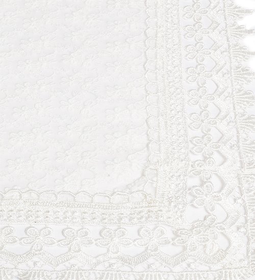 Скатерть белая нарядная прямоугольная. На непрозрачной основе густой тюль с вышитыми ромашками. По краю пришито белое кружево.