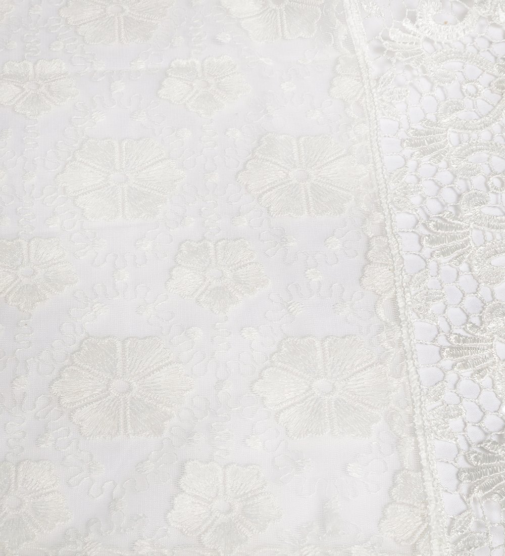 Скатерть из белого густого тюля вышита цветами, по краю нежное кружево.