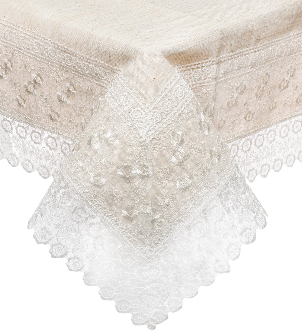 Скатарть квадратная. Цвет кофе с молоком. По краю широкой лентой нашито полупрозрачное кружево с цветочным узором.