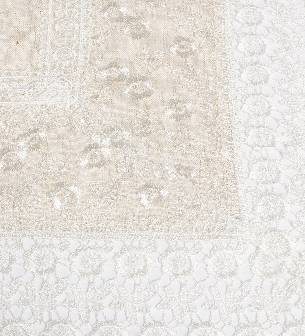 Скатарть квадратная. Цвет кофе с молоком. По краю широкой лентой нашито полупрозрачное кружево с цветочным узором.