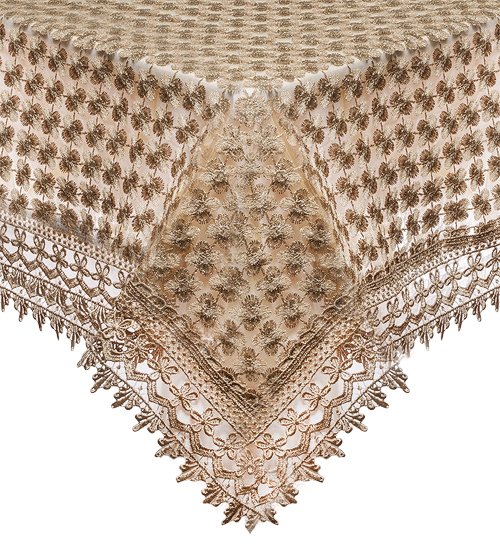 Скатерть двухслойная квадратная. Основа непрозрачная, сверху тюль с вышитыми гладью бархатными цветами клевера. По краю кружево.