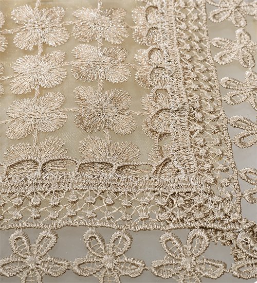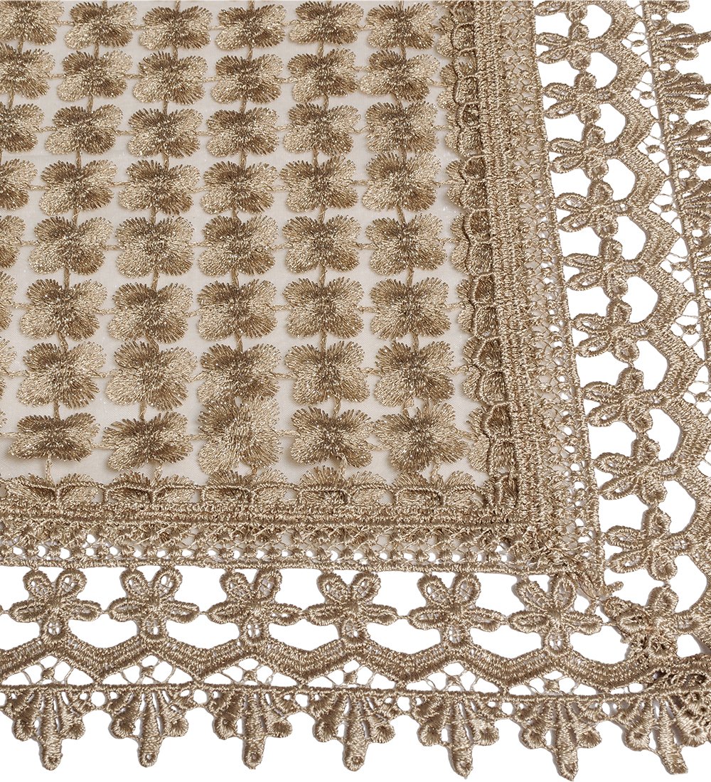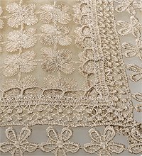 Скатерть двухслойная квадратная. Основа непрозрачная, сверху тюль с вышитыми гладью бархатными цветами клевера. По краю кружево.
