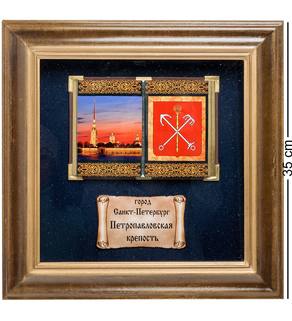 Панно в деревянной раме. На флокированном паспарту прикреплена книга с изображением красивейшего вида Петропавловской Крепости и малого герба г.Санкт-Петербурга. Способом сублимации на металле созданы исторические страницы, украшенные золотом. Название панно размещено внизу панно на папирусе.