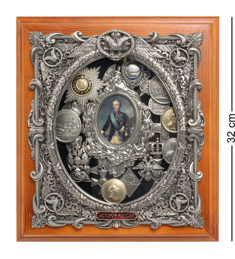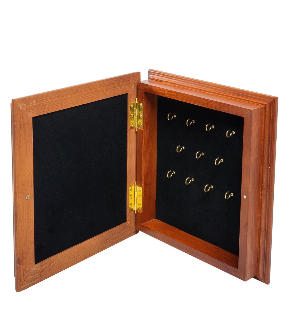 Ключница ручной работы, изготовленная из твердых пород древесины опытными мастерами по дереву. Каждая деталь ключницы тщательно проработана. Монеты и другие знаки являются точными копиями, соответствующими эпохе, представленной в изделии. Изображение Суворова нанесено на холст. Верхняя часть (крышка) композиции декорируется филигранными рельефами методом гальванопластики из меди. Внутреннее пространство обито мягким бархатом. Петли и 11 крючков выполнены из латуни. Крышка закрывается с помощью магнита. На обратной стороне есть крепления на стену.
