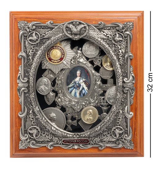 Панно ручной работы, изготовленное из твердых пород древесины опытными мастерами по дереву. Каждая деталь панно тщательно проработана и задекорирована филигранным рельефом методом гальванопластики из меди. Изображение Екатерины II нанесено на холст. Элементы декора являются точными копиями, соответствующими эпохе, представленной в изделии. На обратной стороне есть крепление на стену.