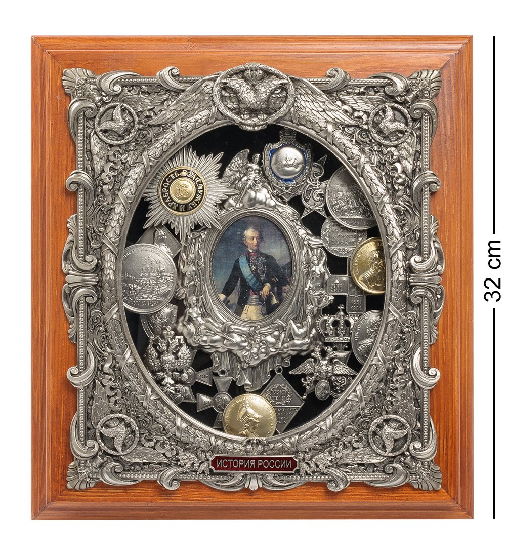 Панно ручной работы, изготовленное из твердых пород древесины опытными мастерами по дереву. Каждая деталь панно тщательно проработана и задекорирована филигранным рельефом методом гальванопластики из меди. Изображение Суворова нанесено на холст. Элементы декора являются точными копиями, соответствующими эпохе, представленной в изделии. На обратной стороне есть крепление на стену.