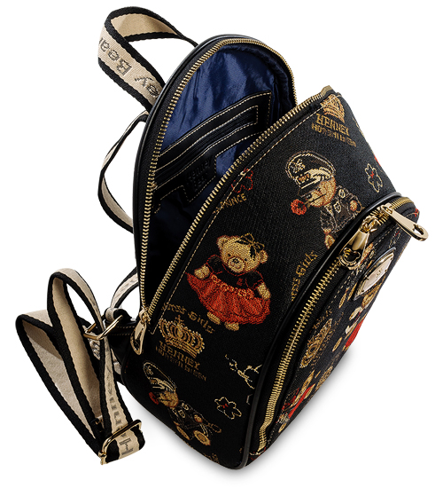 Прочный и лёгкий рюкзак из гобелена В рюкзаке предусмотрено два основных отделения на двухсторонней молнии. Плотная ткань легко чистится от загрязнений и быстро сохнет. Рюкзак имеет стильный дизайн и функциональность. Сверху есть петля, лямки выполнены из плотной ткани, регулируются и украшены металлическими карабинами. Внутри основного отделения находятся два кармана: подвесной карман и на молнии. Дно рюкзака из экокожи и имеет 4 металлические округлые ножки - практично и не пачкается, когда мы ставим сумку на разные поверхности.