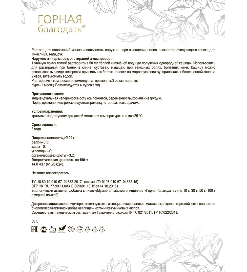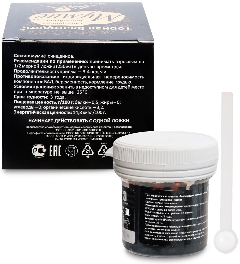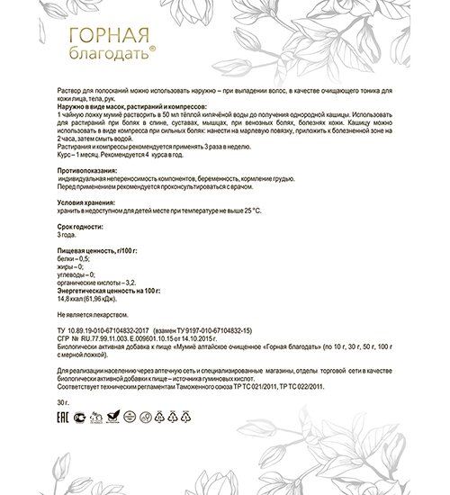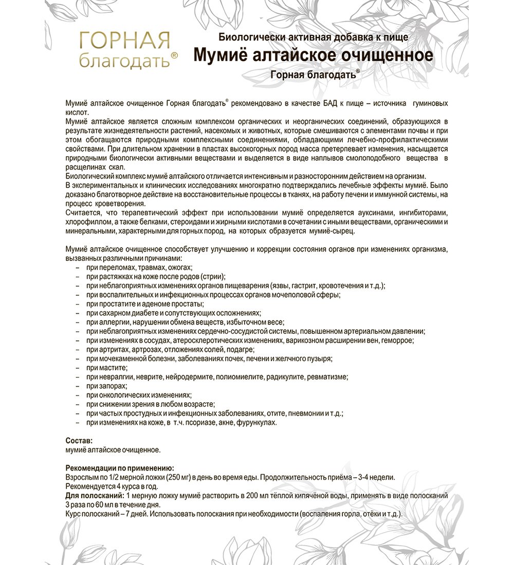 Мумиё алтайское очищенное Горная благодать® рекомендовано в качестве БАД к пище – источника гуминовых кислот.