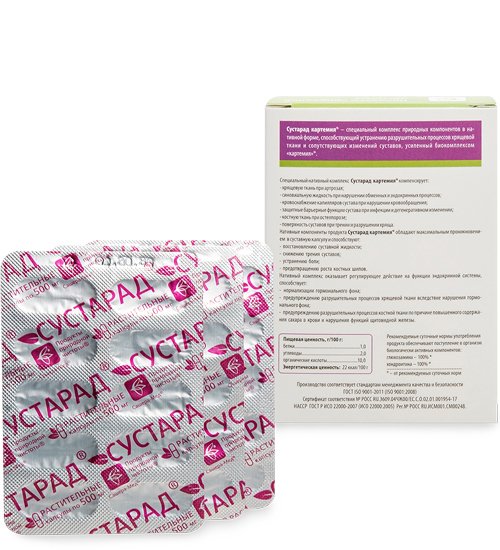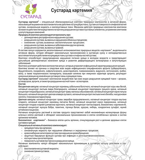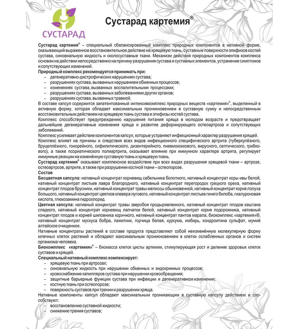 Комплекс «Сустарад» картемия® усиливает действие компонентов капсул, которые устраняют инфекционный характер разрушения хрящей.