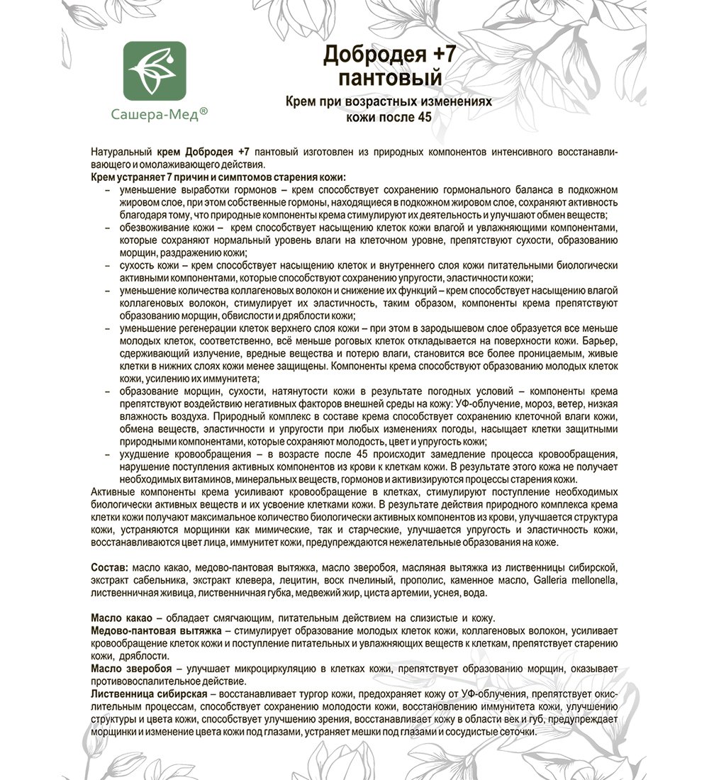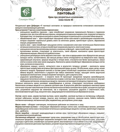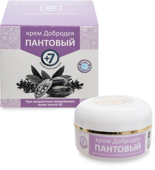Натуральный крем Добродея +7 пантовый изготовлен из природных компонентов интенсивного восстанавливающего и омолаживающего действия.
