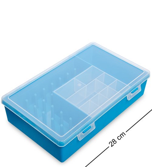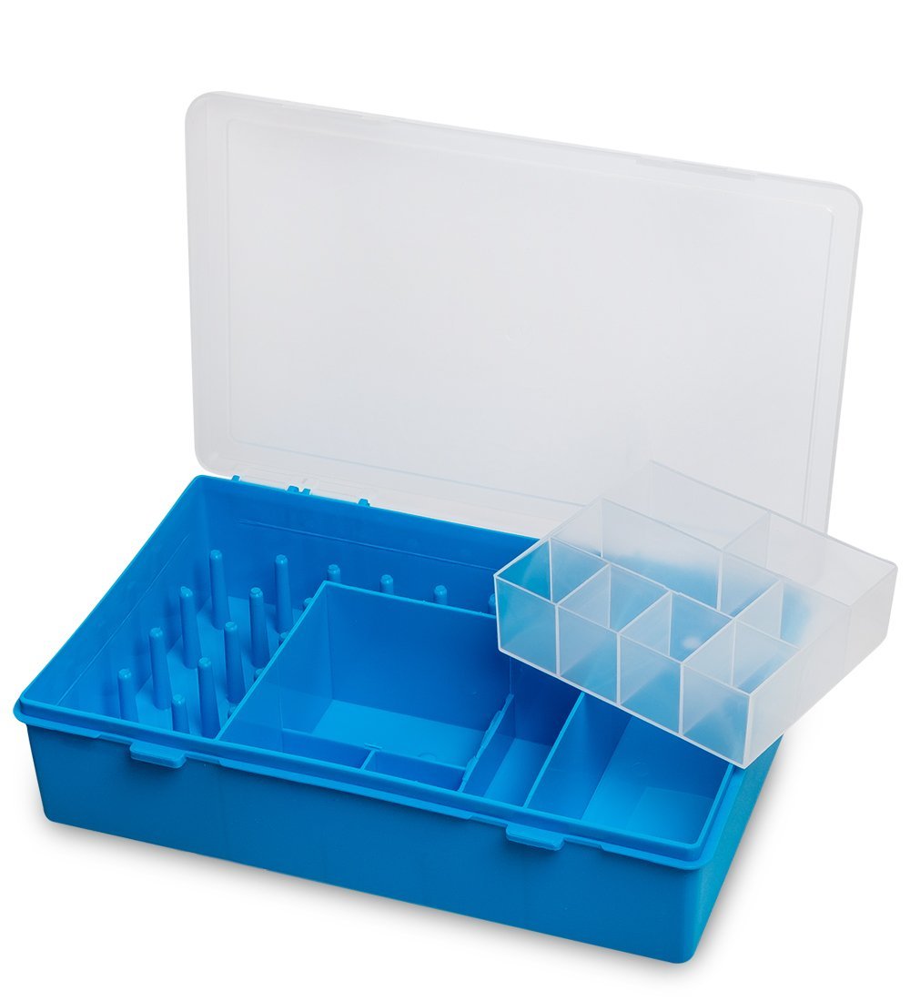 Органайзер для хранения мелких швейных принадлежностей с ячейками различных размеров и с 27-ю посадочными местами под катушки с нитками, из которых 22 места под катушки стандартного диаметра и 5 мест под катушки увеличенного диаметра.