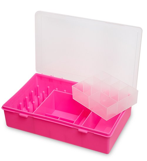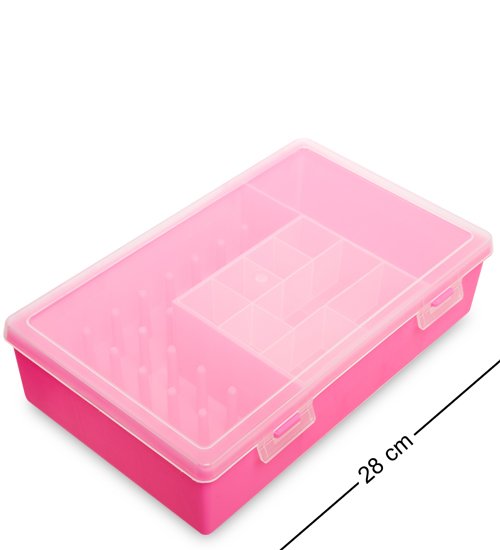 Органайзер для хранения мелких швейных принадлежностей с ячейками различных размеров и с 27-ю посадочными местами под катушки с нитками, из которых 22 места под катушки стандартного диаметра и 5 мест под катушки увеличенного диаметра.