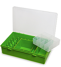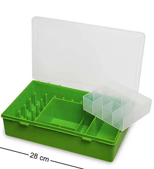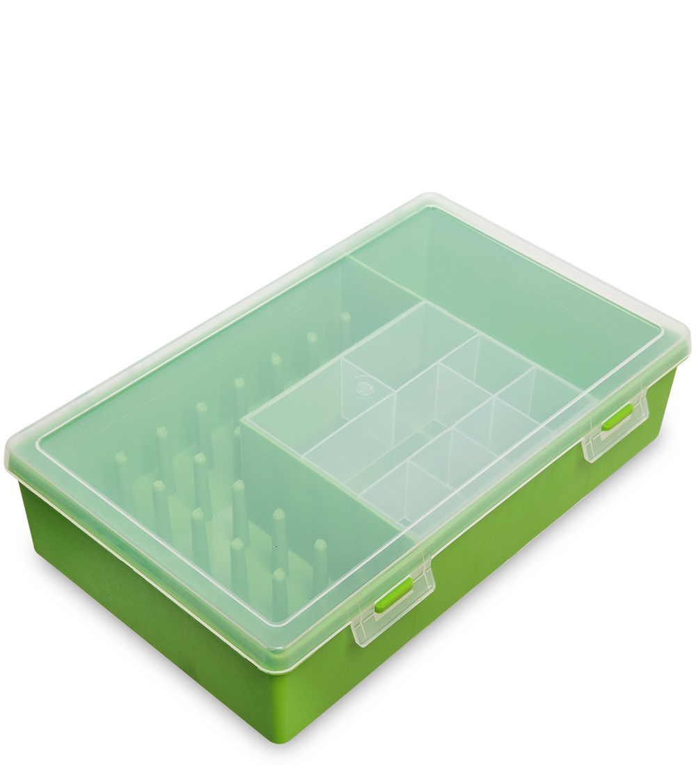 Органайзер для хранения мелких швейных принадлежностей с ячейками различных размеров и с 27-ю посадочными местами под катушки с нитками, из которых 22 места под катушки стандартного диаметра и 5 мест под катушки увеличенного диаметра.