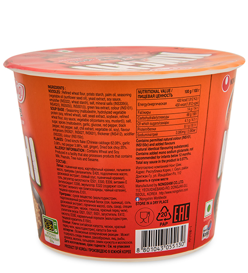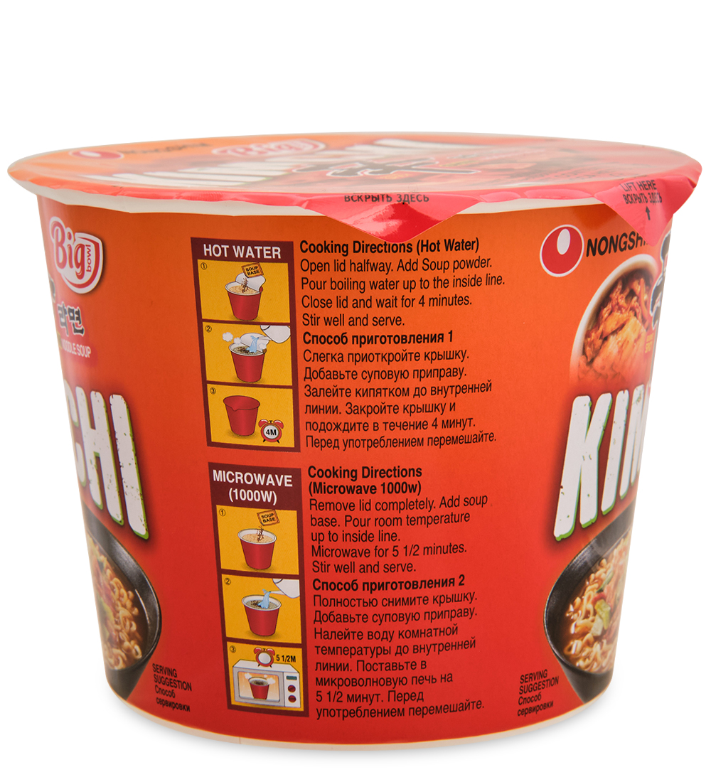 Чашка лапши Кимчи Рамен – свежая и вкусная паста из пшеничной муки в густом ароматном бульоне. Квашеные овощи кимчи – абсолютный хит корейской кухни: здесь их едят на завтрак, обед и ужин. Они укрепляют иммунитет и обеспечивают правильное пищеварение благодаря полезным молочнокислым бактериям. На протяжении 30-ти лет кимчи лидирует в списке самых любимых вкусов «быстрой» корейской лапши. Весомый повод познакомиться с культовым блюдом поближе! На основе этого продукта от Нонгшим можно создавать десятки вариаций блюд: мясные и овощные супы, запеканки и гарниры, добавляя в Рамен соответствующие ингредиенты.
