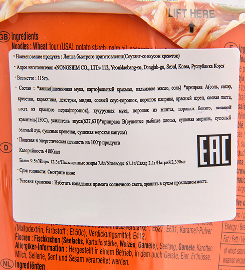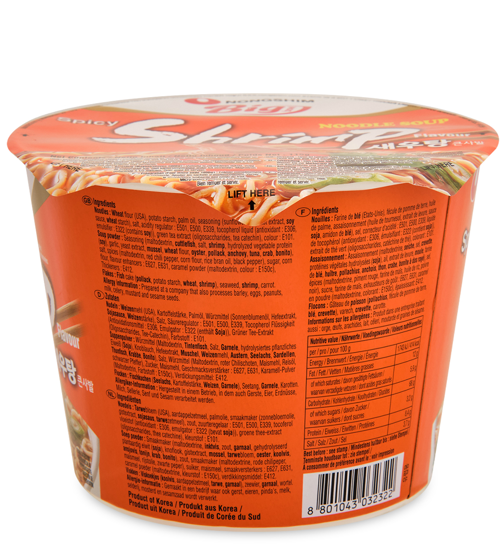 Корейский бренд Нонгшим тщательно следит за качеством и рецептурой своей продукции, и создает уникальные вкусы, среди которых каждый может выбрать тот, что ему по нраву. Пикантная смесь специй (лук, чеснок, имбирь, перец, креветки, морская капуста) обеспечивает лапше комфортную степень остроты. Тонкий и упругий рамен в ароматном бульоне – настоящее наслаждение для гурманов.