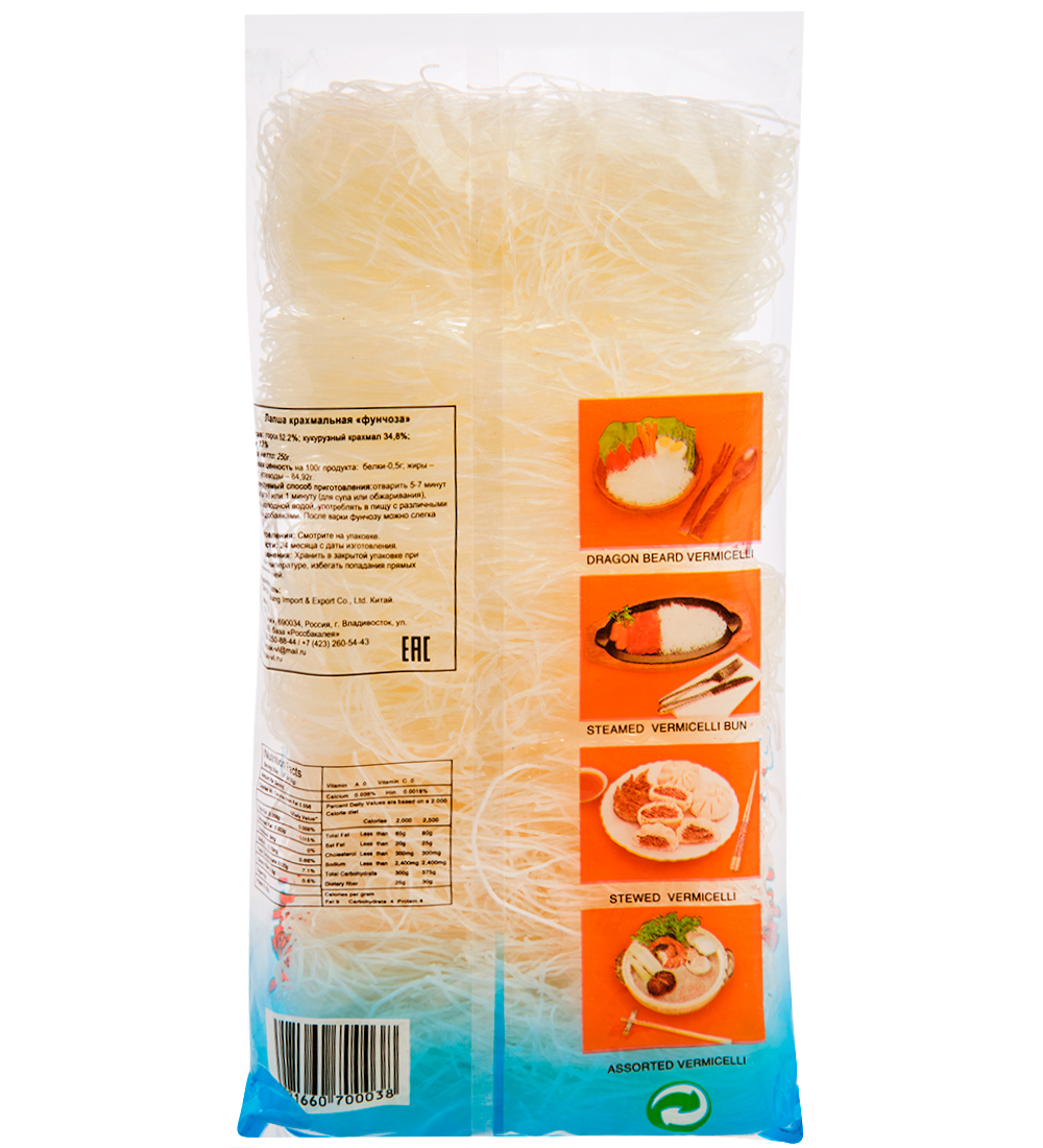 Крахмальная лапша превосходного качества. Подходит для супов, вторых блюд, салатов. Фунчоза LongKou отлично впитывает вкус и аромат других продуктов, потому идеально сочетается с любыми соусами. Фунчоза LongKou это высококачественная крахмальная лапша с отличными характеристиками. Она обладает приятной эластичностью, в готовом виде становится прозрачной и приобретает стеклянный блеск. Это популярный ингредиент для блюд азиатской кухни, а также идеальный гарнир к любым продуктам.