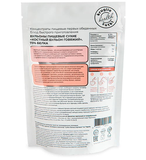 Материал: Гидролизованный коллаген говяжий, бульон костный пищевой сухой говяжий, пептиды коллагена говяжьего, соль, луковый порошок, масло оливковое сухое, инулин (пребиотик), петрушка сухая, укроп сухой