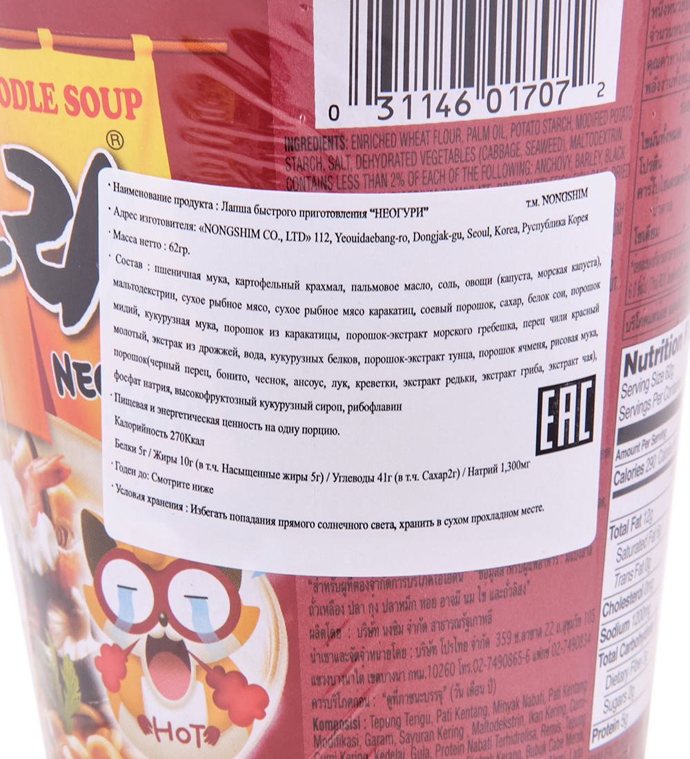 ER-163 Лапша «Нонгшим» (сушеная) Неогури (стакан), 4шт х 62 г, Корея