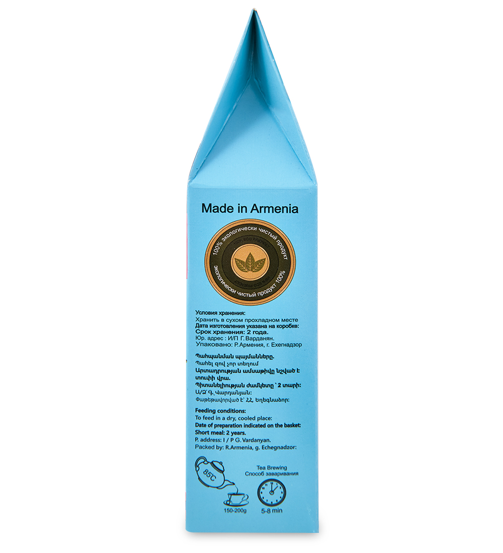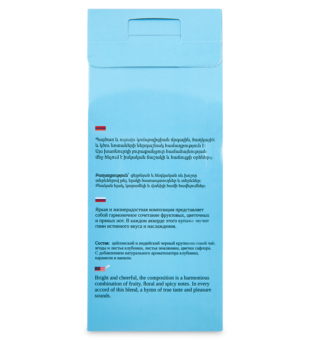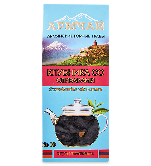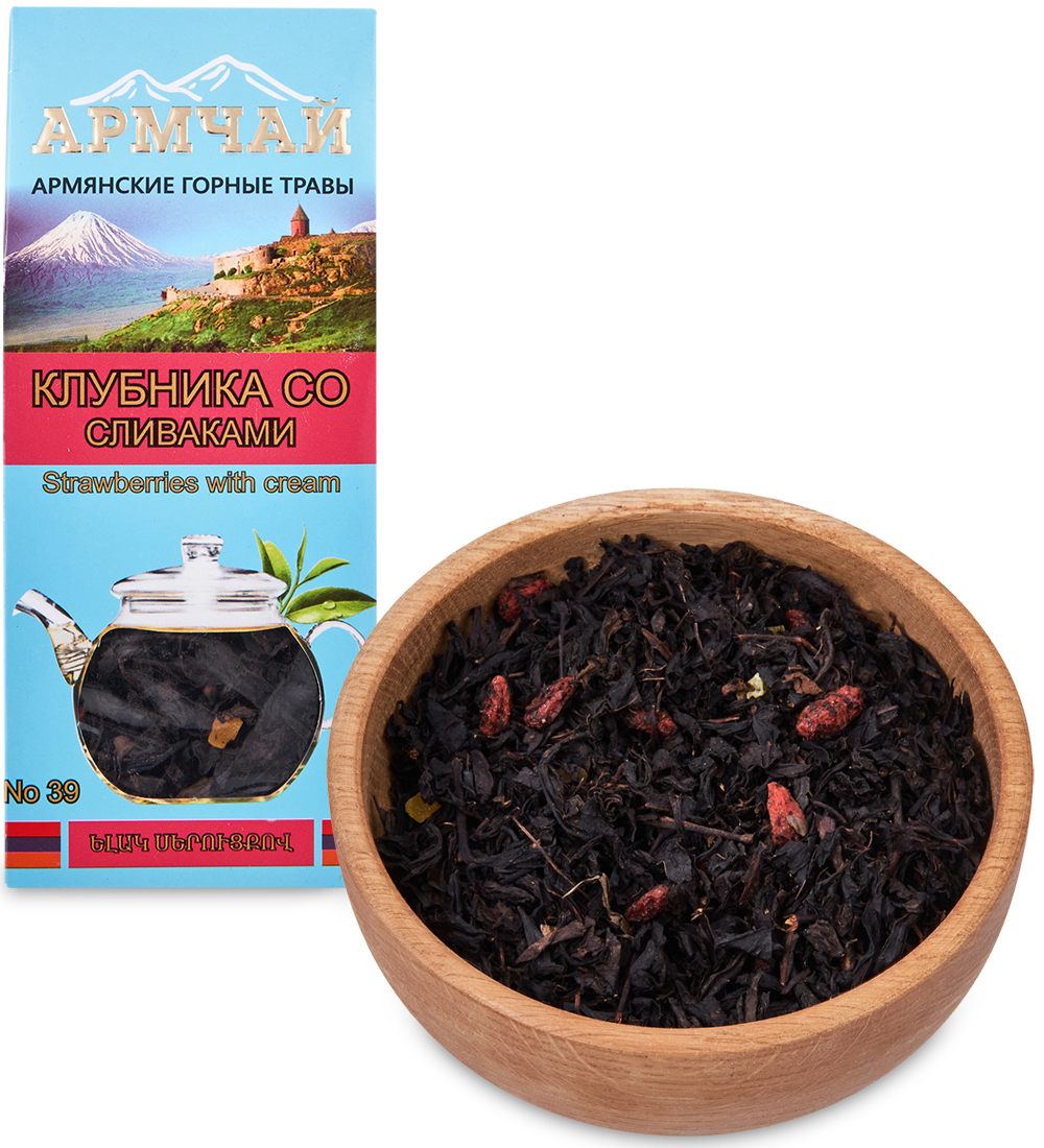 Материал: Цейлонский и индийский крупнолистовой чай, ягоды и листья клубники, листья земляники, цветки сафлора. С добавлением натурального ароматизатора клубники, карамели и ванили