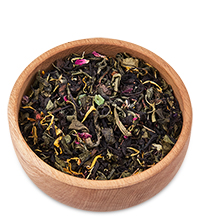 Материал: Цейлонский черный крупнолистовой чай, зеленый крупнолистовой чай, лепестки розы, голубая мальва, цветы жасмина, лепестки календулы, кусочки цукатов папайи, манго, ананас