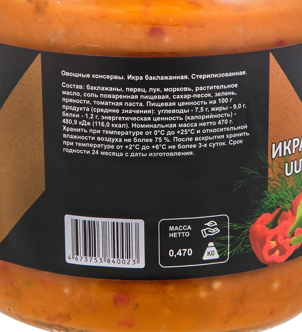 Материал: Баклажаны, перец. лук, морковь, растительное масло, соль поваренная пищевая, сахар-песок, зелень, томатная паста.