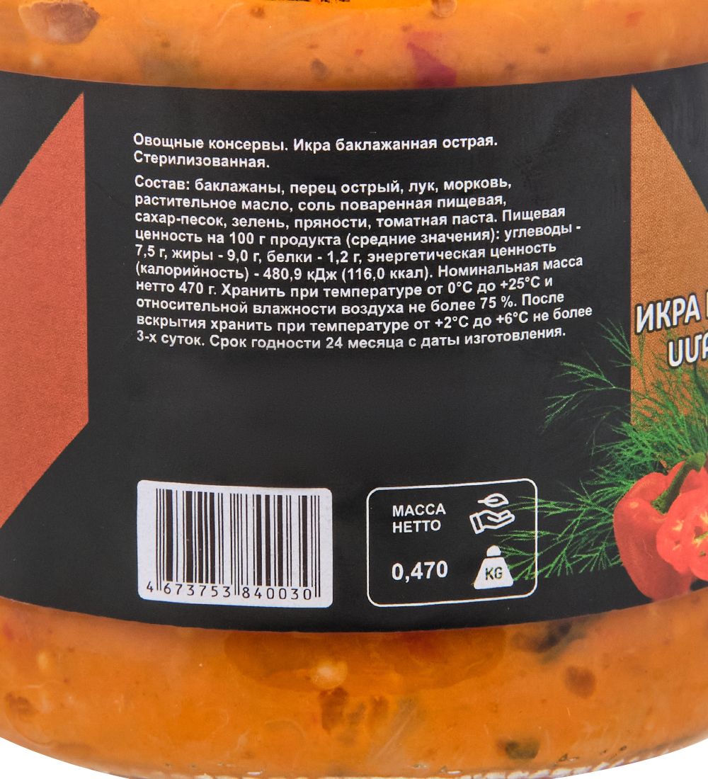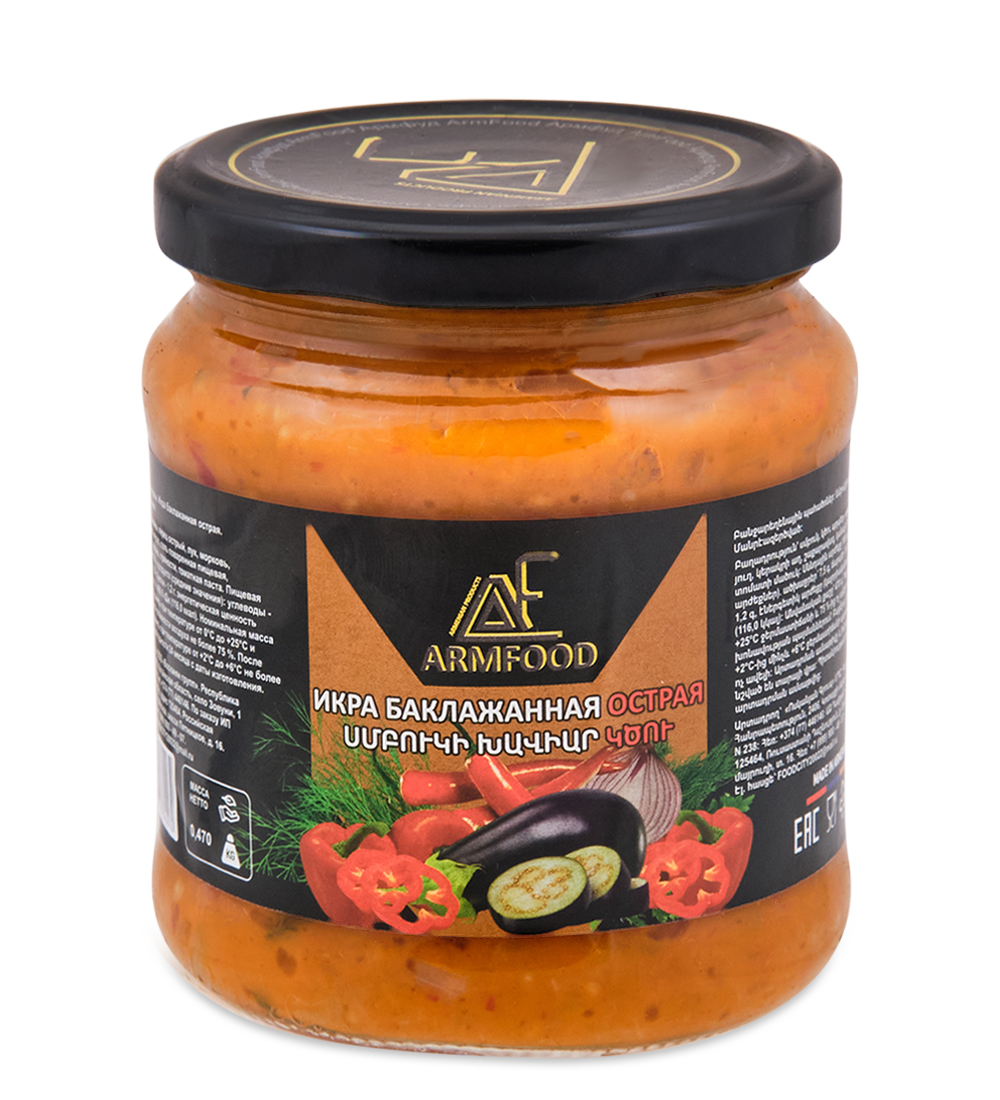 Материал: Баклажаны, перец острый. лук, морковь, растительное масло, соль поваренная пищевая, сахар-песок, зелень, пряности, томатная паста.