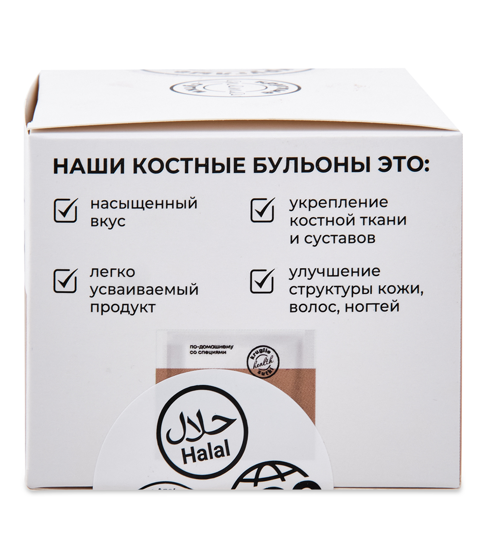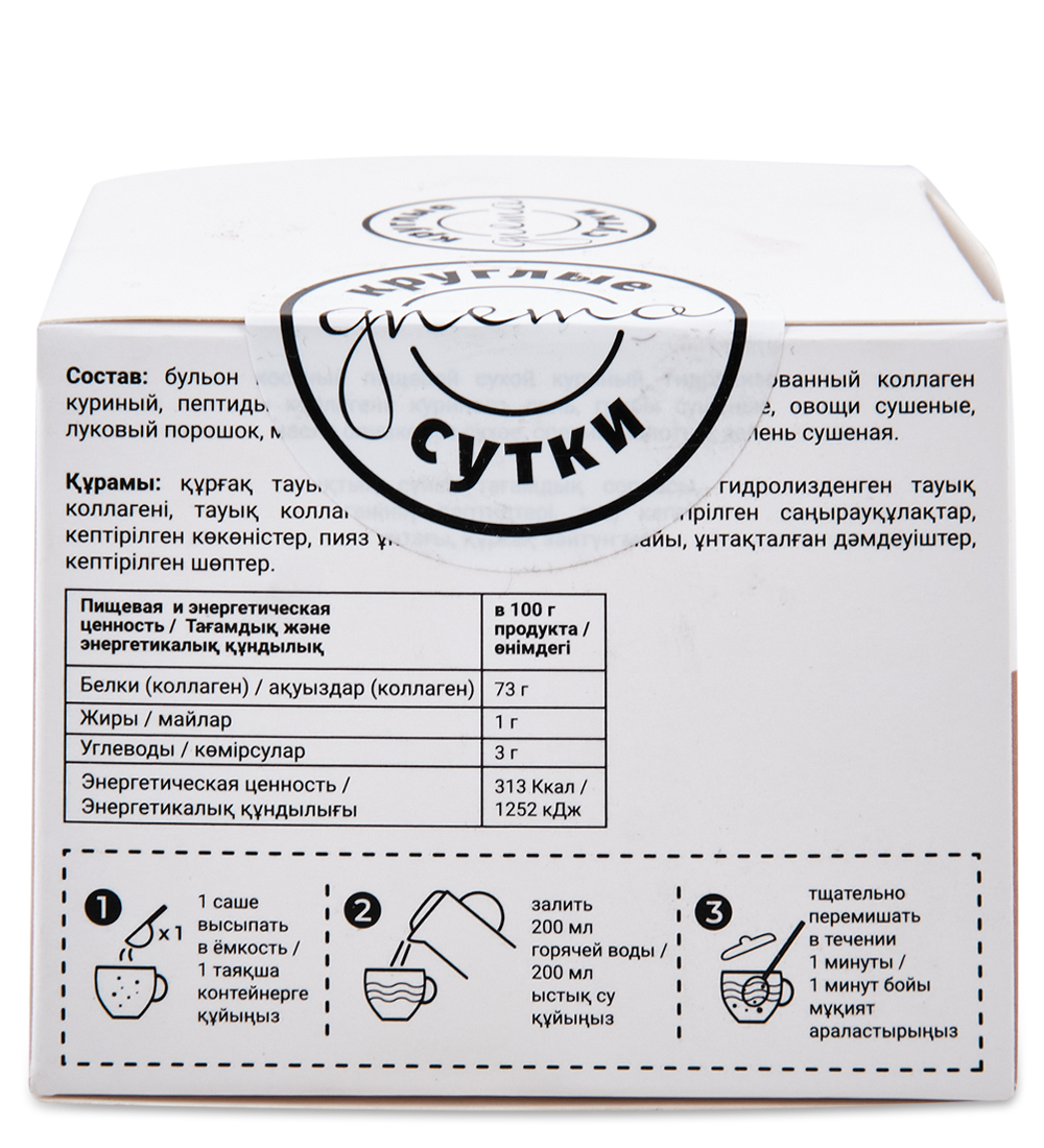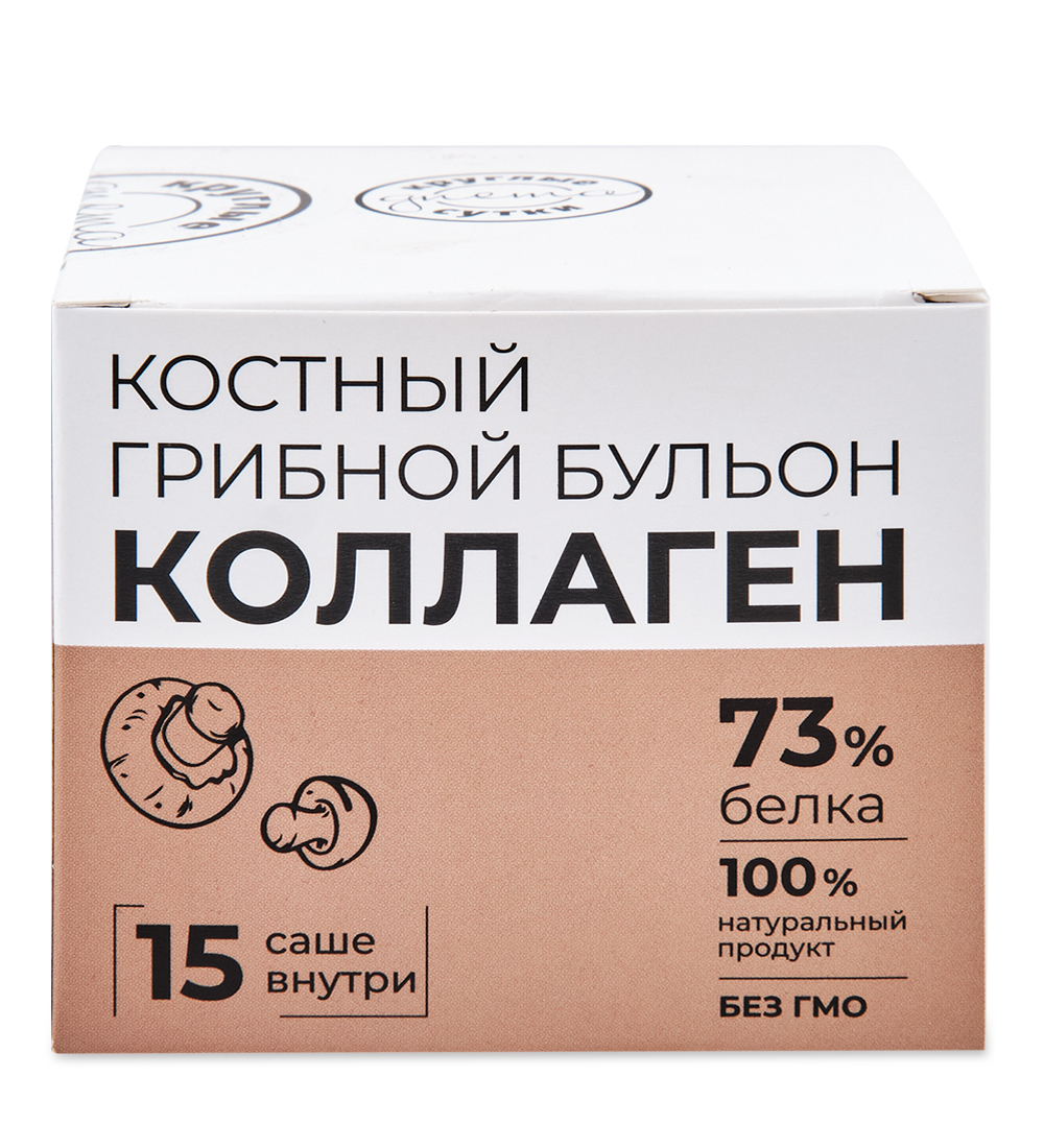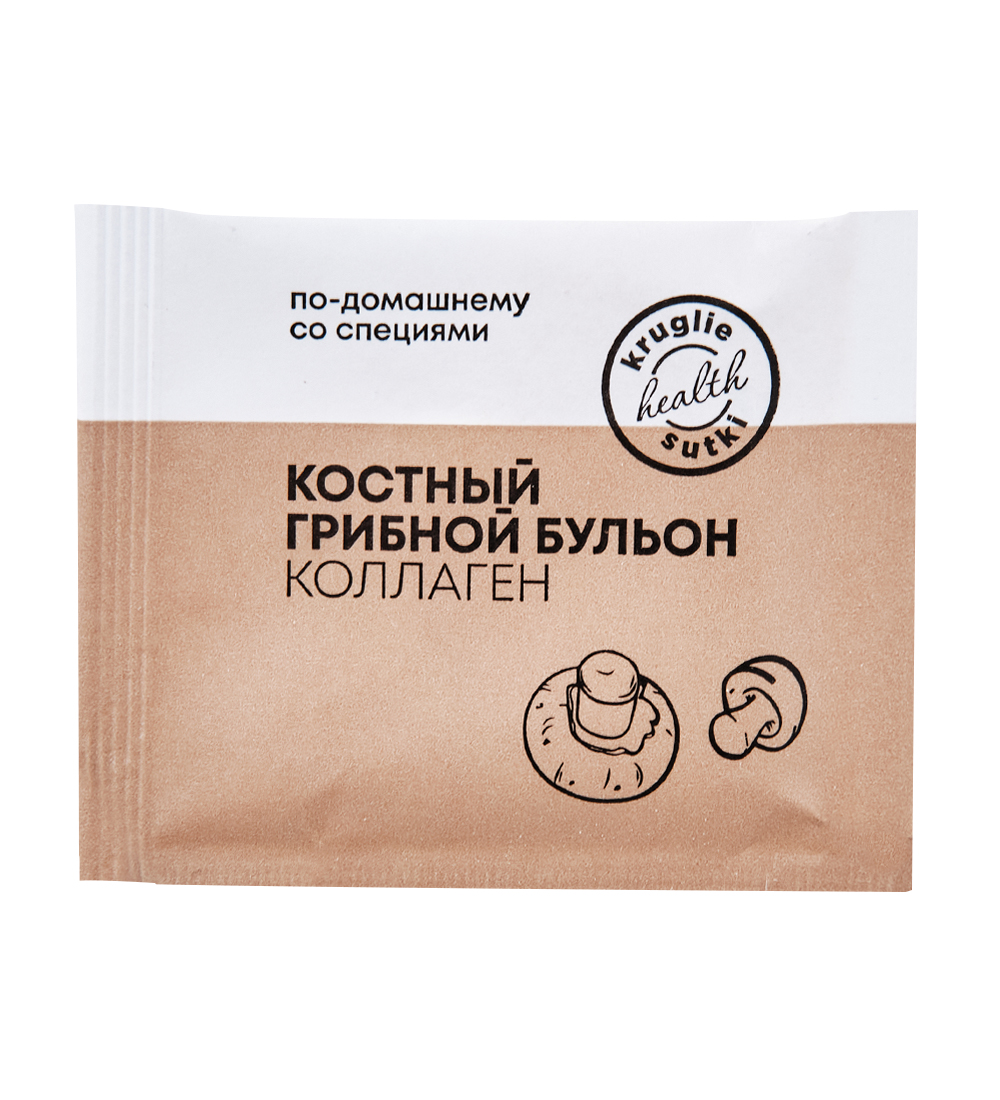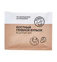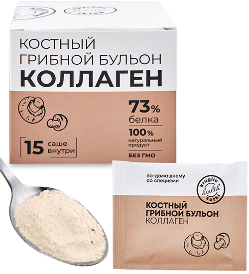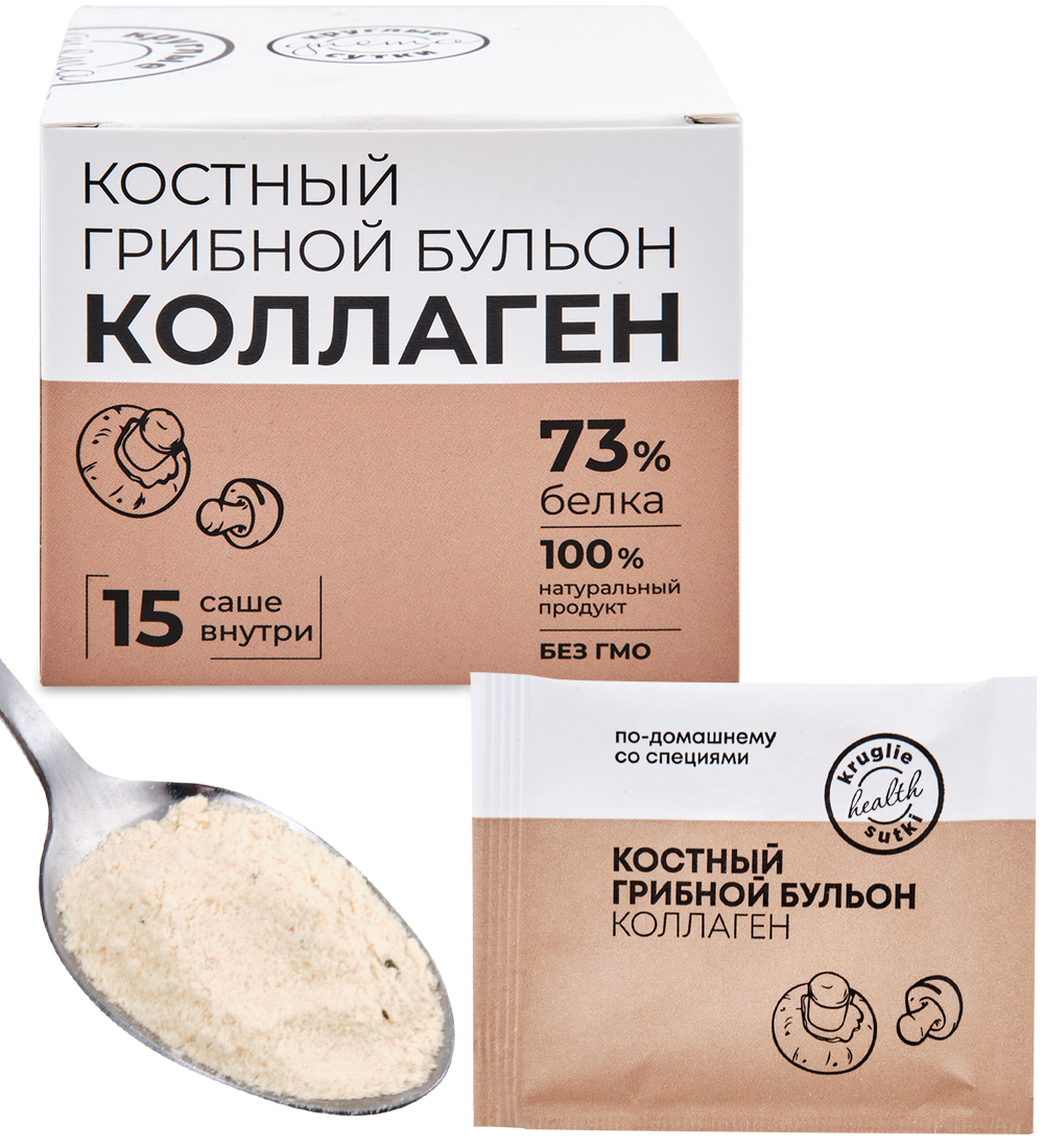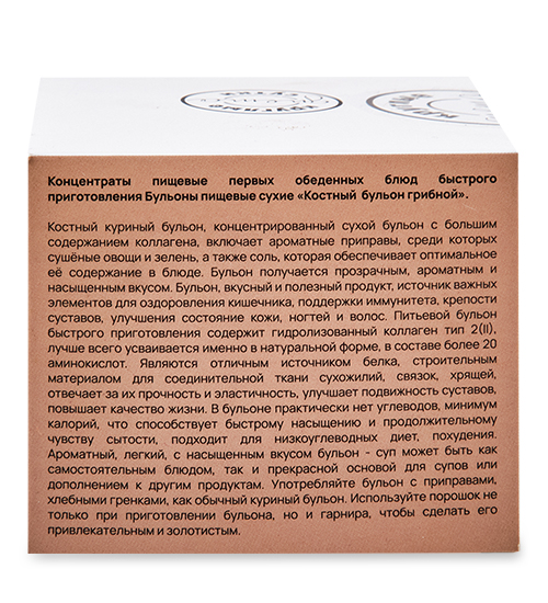 Материал: Гидролизованный коллаген куриный, бульон костный пищевой сухой куриный, пептиды коллагена куриного, соль, грибы сушеные, овощи сушеные (морковь, чеснок), луковый порошок, оливковое масло, специи молотые, петрушка сухая, укроп сухой