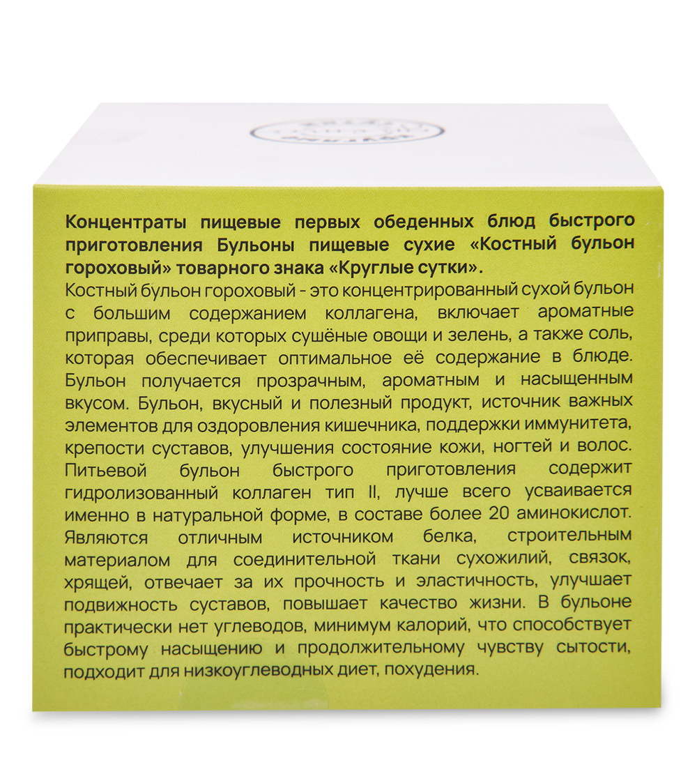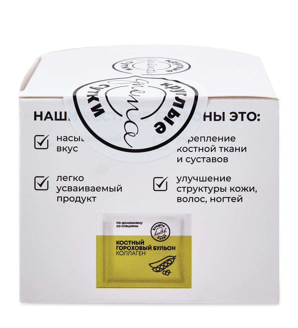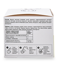 Материал: Гидролизованный коллаген куриный, бульон костный пищевой сухой куриный, пептиды коллагена куриного, протеин гороховый, гороховая мука, соль, луковый порошок, оливковое масло, зелень петрушки, лавр, куркума, розмарин