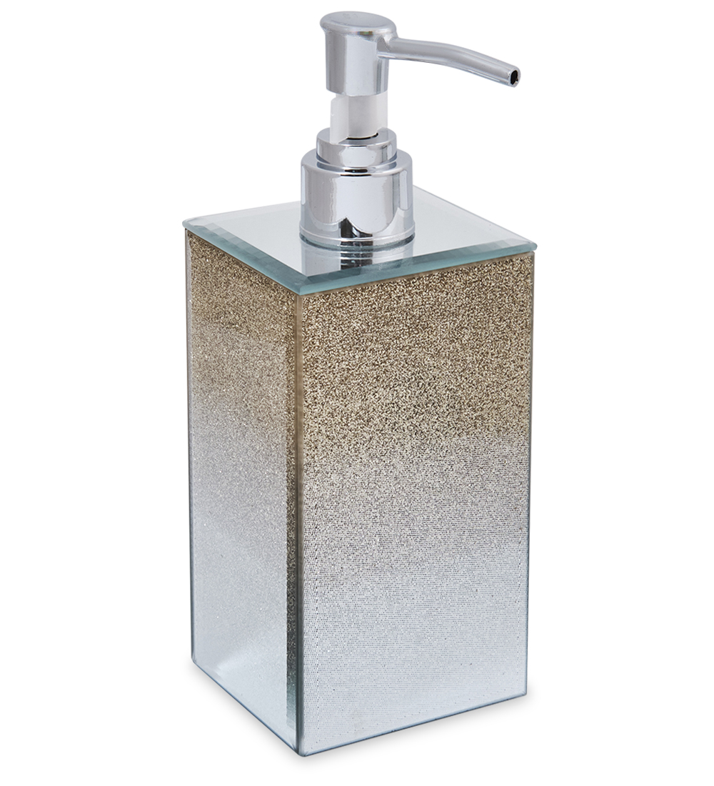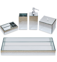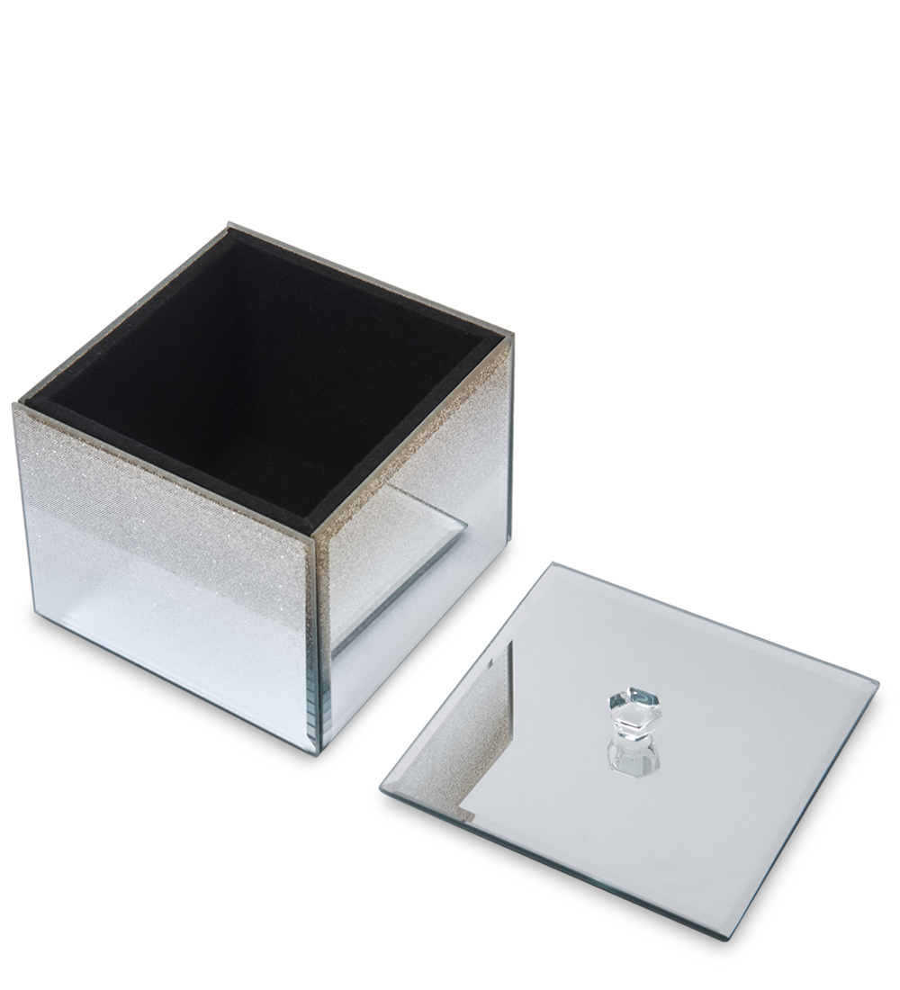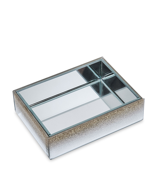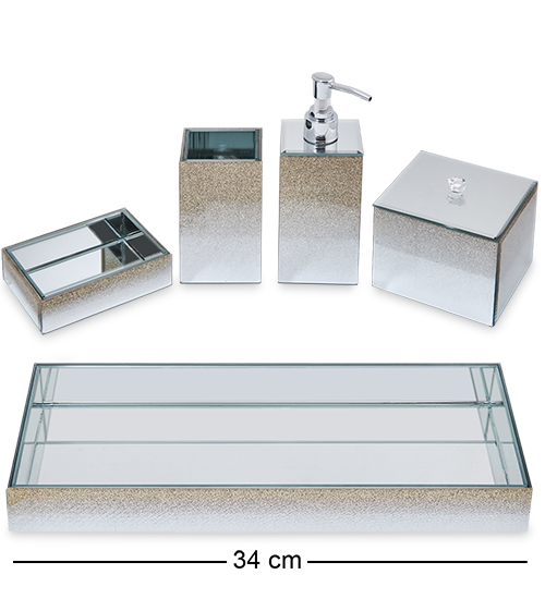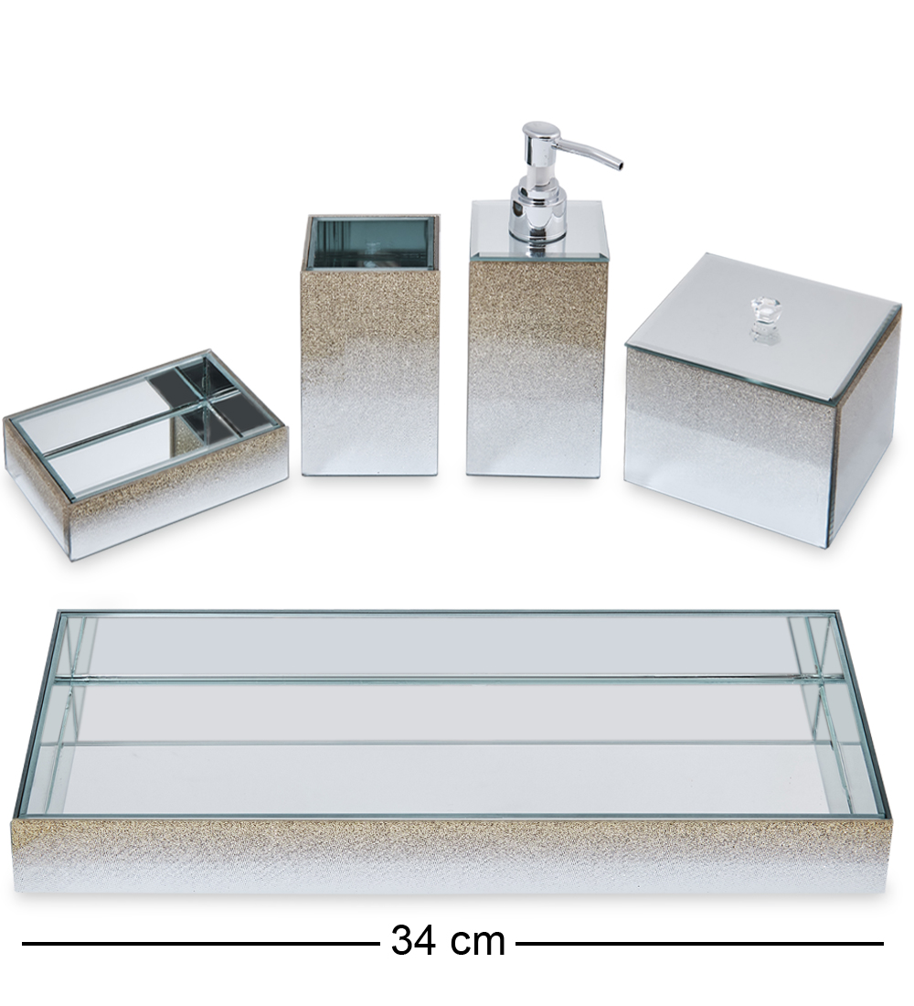 Материал: стекло (зеркало) Подставка - 34х13х4 см, 835гр. Дозатор 6,5х5,5х17,5 см, 330 гр. Шкатулка - 9,5х9,5х9,5 см (высота с учетом ручки на крышке), 383 гр. Мыльница - 11,3х8,3х3 см, 220 гр. Стакан - 6,5х6х11,5 см, 410 гр.