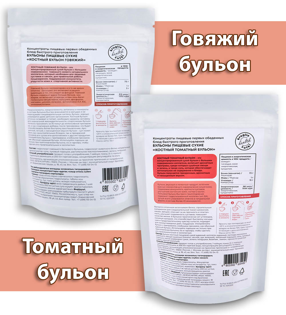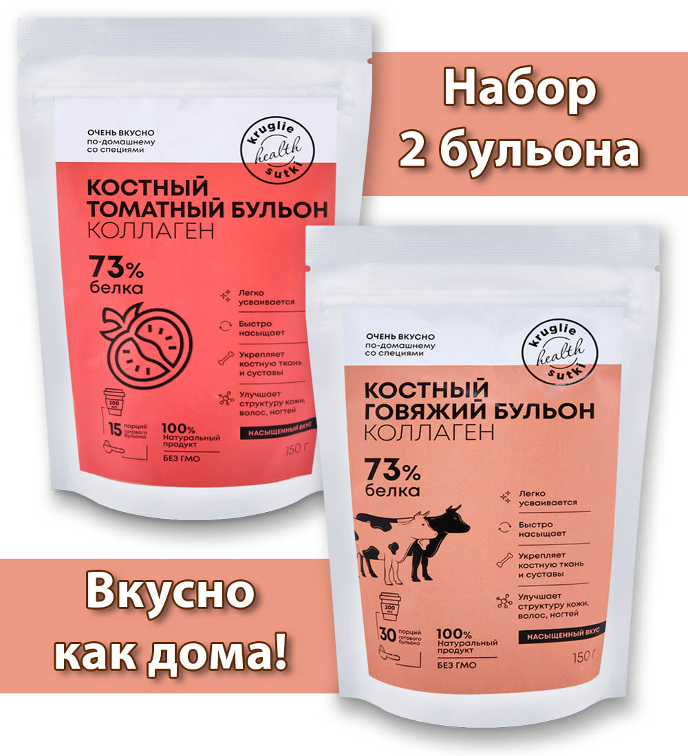 Материал: Говяжий: Гидролизованный коллаген говяжий, бульон костный пищевой сухой говяжий, пептиды коллагена говяжьего, соль, луковый порошок, масло оливковое сухое, инулин (пребиотик), петрушка сухая, укроп сухой. Томатный: Бульон костный пищевой куриный, гидролизованный коллаген куриный, пептиды коллагена куриного, овощи сушеные (томаты, чеснок, лук зелёный), соль, масло оливковое, луковый порошок, пребиотик (инулин), петрушка сухая, укроп сухой.