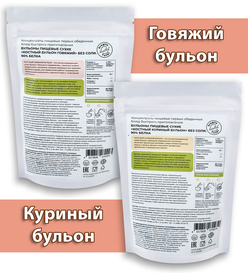 Материал: Говяжий: Гидролизованный коллаген говяжий, бульон костный пищевой сухой говяжий, пептиды коллагена говяжьего, луковый порошок,масло оливковое сухое, пребиотик (инулин), петрушка сухая, укроп сухой. Куриный: Коллаген гидролизованный куриный, бульон костный пищевой куриный сухой, куркума, оливковое масло, луковый порошок, пребиотик (инулин), петрушка сухая, укроп сухой.