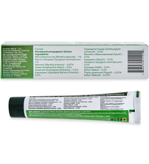 Материал: Активный ингредиент (Active ingredient): Мята Колосистая (Mentha piperata) – 1%, Масло Гвоздика (Syzygium aromaticum) – 1%, Ментол (Mentha arvensis) – 0.67%, Нима (Azadirachta indica) – 0,5%, Акмелла Огородная (Akarkara) – 0.5%, Барлерия (Vajradanti Barleria Prionitis) – 0,5%, Теджовати/томар (Zanthoxylum armatum) – 0.5%, Фенхель Обыкновенный (Saunf) – 0.5%, Кардамон (Elaichi) – 0.5%, Гвоздика (Syzygium aromaticum) – 0.5%, Куркума (Haldi) – 0.5%, Бакул (Bakul) – 0.5%, Перец длинный (Pippali) – 0.25%, Бабул (Babool) – 0.25%. Основа (Base) – q.s.: Кальция Карбонат (Calcium Carbonate)- 44,13%, Дистиллированная Вода (Distilled Water)- 22,07%, Глицерин (Glycerin)- 21%, Лаурилсульфат Натрия (Sodium Lauryl Sulphate)- 2.5%, Осажденный Диоксид Кремния (Precipitated Silica)-1%, Карбокси Метил Целлюлоза (Carboxy Methyl Cellulose)-1%, Натрия Сахарин (Sodium Saccharin)- 0.63%.