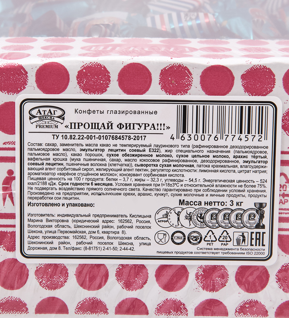 Материал: Сахар, заменитель масла какао не темперируемый лауринового типа (рафинированное, дезодорированное пальмоядровое масло, эмульгатор лецитин соевый Е322), жир специалтного назначения (пальмоядровое пальмовое масло), какао порошок, сухое обезжиренное молоко, сухое цельное молоко, арахис тертый, вафельная крошка (мука пшенияная, сахар, масло кокосовое рафинированное, дезодорированное эмульгатор соевый лецитин, пшеничные волокна (клетчатка), сыворотка сухая молочная, патока крахмальная, влагоудерживающий агент сорбитовый сироп, желирующий агент пектин, регулятор кислотности: лимонная кислота, цитрат натрия, ароматихатор "вареное сгущенное молоко"), консервант сорбиновая кислота.