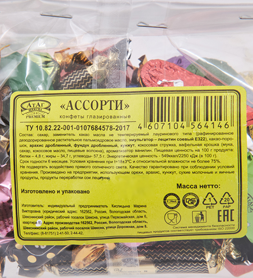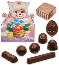 Материал: Сахар, заменитель какао-масла нетемперируемого лауринового типа (рафинированное дезодорированное масло пальмоядровое, пальмовое масло), жир специального назначения (рафинированные дезодорированные растительные масла), эмульгатор лецитин соевый (Е322), какао-порошок, сыворотка сухая молочная, патока, пшеничные отруби (клетчатка), сироп, масло томатное оливковое, ароматизатор «коньяк», соль морская, консервант – сорбиновая кислота.