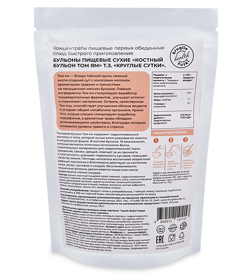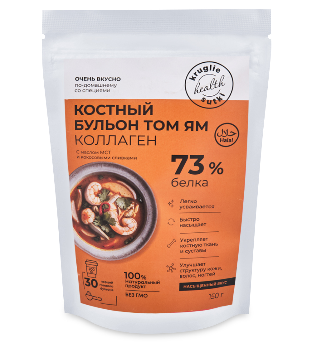 Материал: Бульон костный пищевой сухой говяжий, гидролизованный коллаген говяжий, пептиды коллагена говяжьего, соль, масло оливковое сухое, дрожжевой экстракт, куркума молотая, томатный порошок, экстракт натуральных специй, имбирь молотый, листья кафрского лайма, лемонграсс, масло MCT, кокосовые сливки.
