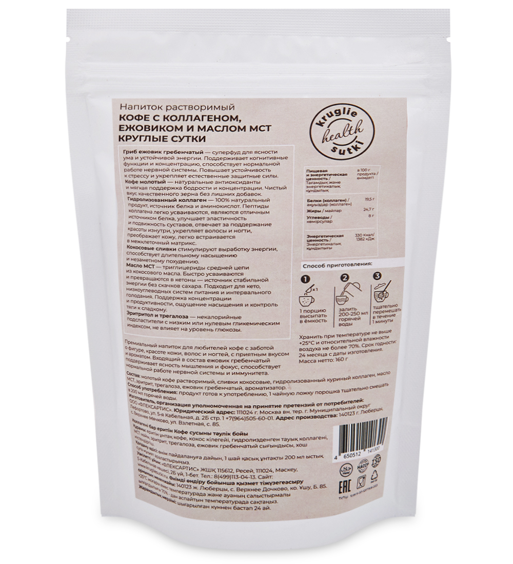 Материал: Молотый кофе растворимый, сливки кокосовые, гидролизованный куриный коллаген, масло МСТ, эритрит, трегалоза, ежовик гребенчатый, ароматизатор.