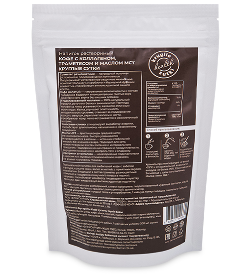 Материал: Молотый кофе растворимый, сливки кокосовые, гидролизованный куриный коллаген, масло МСТ, эритрит, трегалоза, траметес разноцветный, ароматизатор.