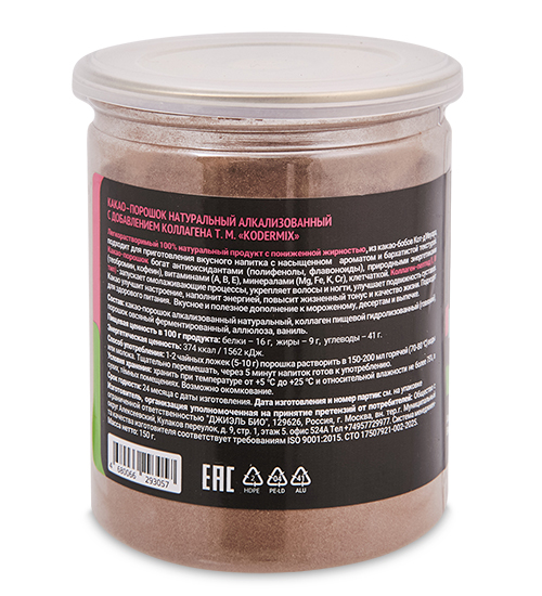 Материал: Какао-порошок алкализованный натуральный, коллаген пищевой гидролизованный (говяжий), порошок овсяный ферментированный, аллюлоза, ваниль.