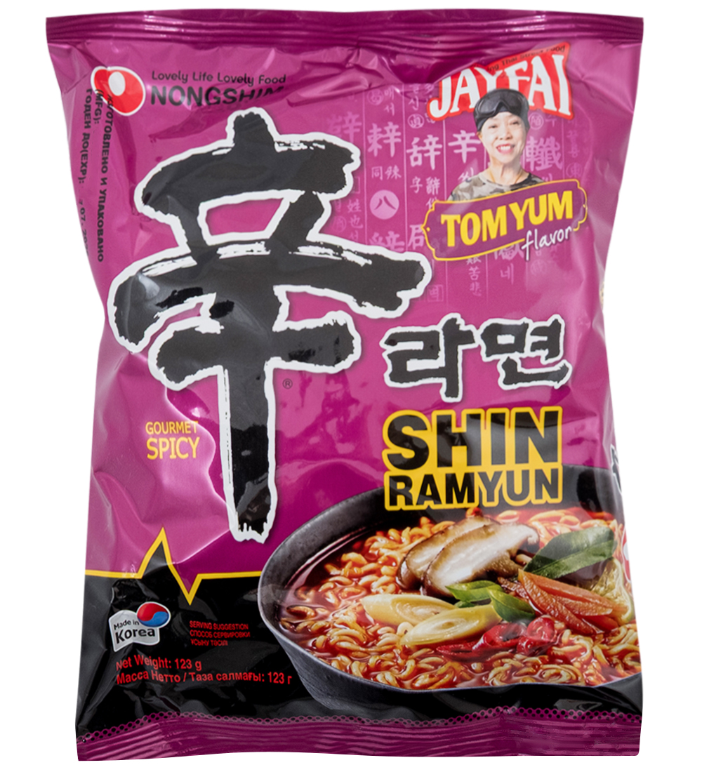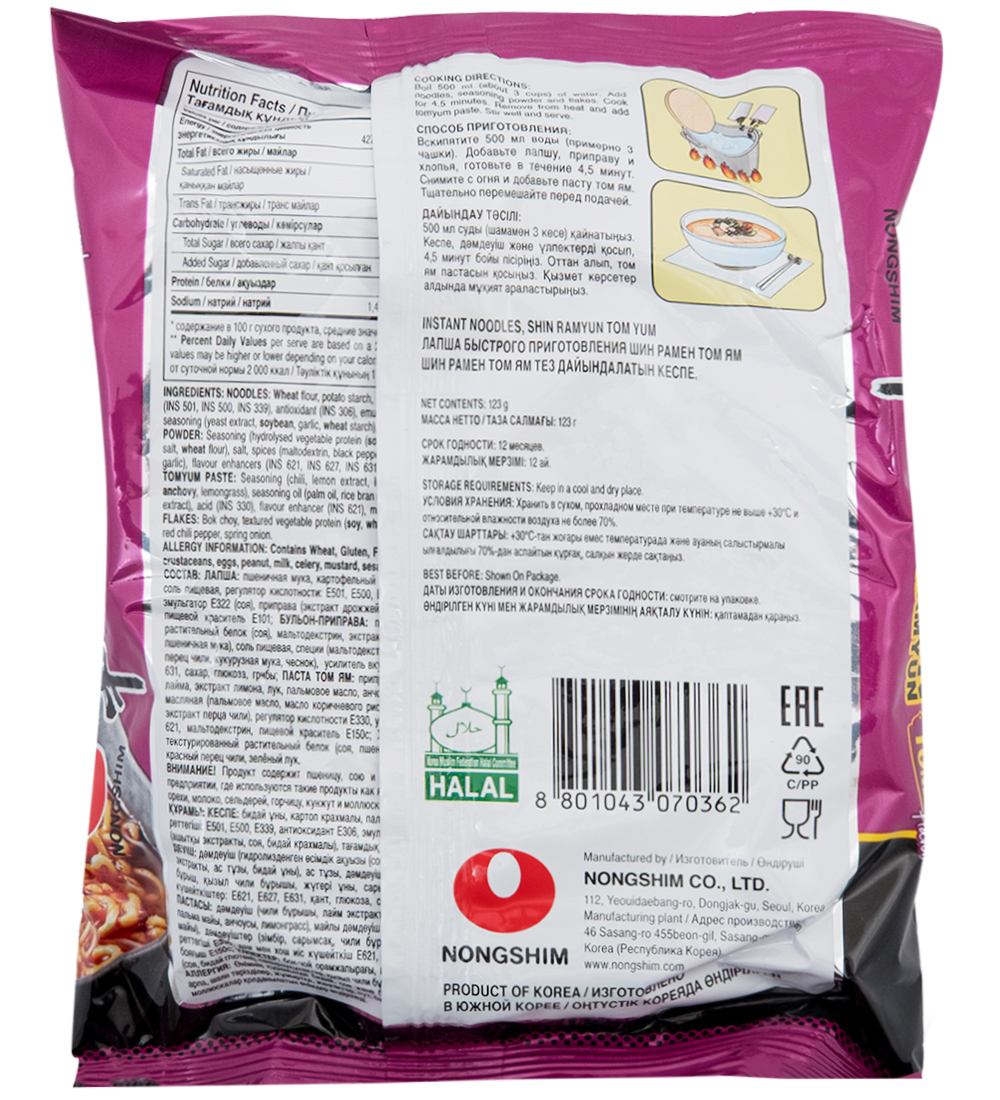 Материал: Лапша: пшенияная мука, картофельный крахмал, мальмовое масло, соль пищевая, регулятор кислотности: Е501, Е500, Е339, антиокислитель Е306, эмульгатор Е322 (соя), приправа (экстракт дрожжей, соя, пшенияный крахмал), пищевой краситель Е101. Бульон-приправа: приправа (гидролизованный растительный белок (соя), мальтодектрин, экстракт дрожжей, соль пищевая, пшенияная мука), соль пищевая, специи (мальтодекстрин, черный перец, красный перец чили, кукурузная мука, чеснок), усилитель вкуса и аромата: Е821, Е627, Е631, сахар, глюкоза, грибы. Паста Том Ям: приправа (перец чили, экстрактлайма, экстракт лимона, лук, пальмовое масло, анчоусы, лемонграсс), приправа масляная (пальмовое масло, масло коричневого риса), специи (имбирь, чеснок, экстракт перца чили), регулятор кислотности Е330, усилитель вкуса и аромата Е621, мальтодекстрин, пищевой краситель Е150с. Хлопья: капусти бок-чой, текстурированный растительный белок (соя, пшеничная клейковина), грибы, красный перец чили, зеленый лук.