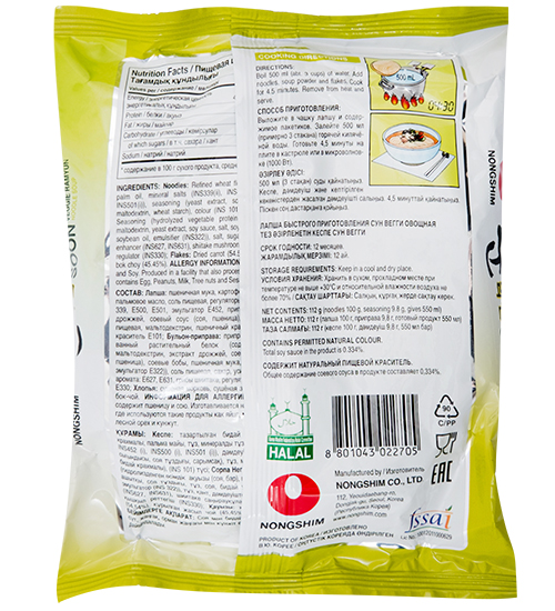 Материал: Лапша: пшеничная мука, картофельный крахмал, пальмовое масло, соль пищевая, регуляторы кислотности: E339, E500, E501, эмульгатор E452, приправа (экстракт дрожжей, соевый соус (соя, пшеница), чеснок, соль пищевая, мальтодекстрин, пшеничный крахмал), пищевой краситель E101, Бульон-приправа: приправа (гидролизованный растительный белок (содержит сою), мальтодекстрин, экстракт дрожжей, соевый соус (соя, пшеница), соевые бобы, пшеничная мука, соевое масло, эмульгатор E322)), соль пищевая, сахар, усилители вкуса и аромата: E627, E631, грибы шиитаке, регулятор кислотности E330, Хлопья: сушёная морковь, сушёная зелёная капуста бок-чой. ИНФОРМАЦИЯ ДЛЯ АЛЛЕРГИКОВ: Продукт содержит пшеницу и сою. Изготавливается на предприятия, где используются такие продукты как яйца, молоко, арахис, лесной орех и кунжут.