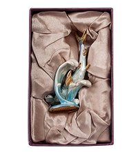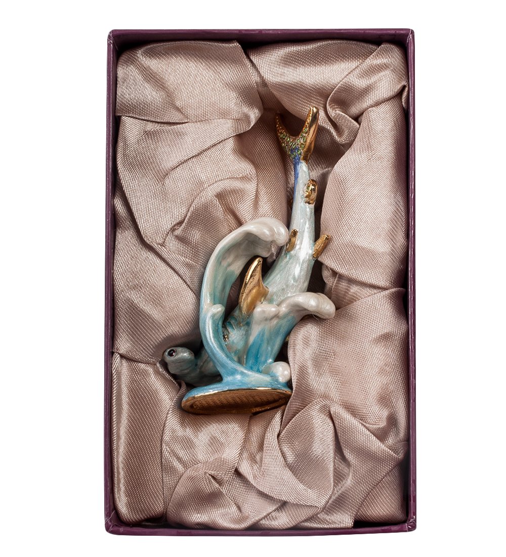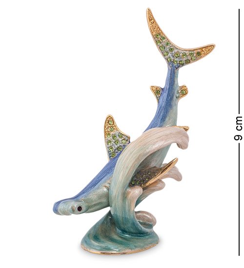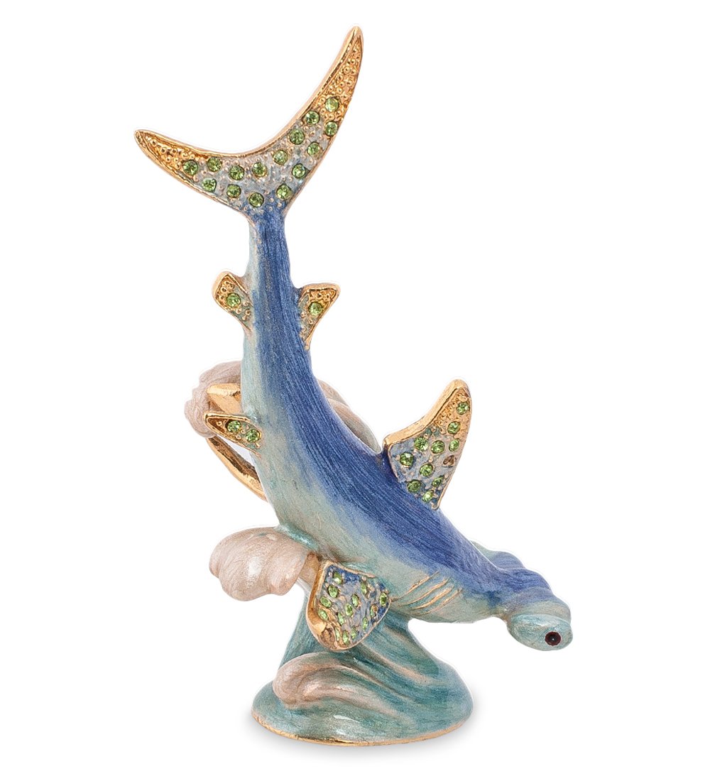 Статуэтка «Рыба-Молот» как нельзя лучше передает красоту и бесстрашие этого животного. Глядя на статуэтку, кажется, будто бы рыба рассекает морские просторы, покоряя непокорные волны. Поверхность изделия выкрашена в голубые и синие тона, а хвост и плавники рыбы украшены мерцающими стразами.