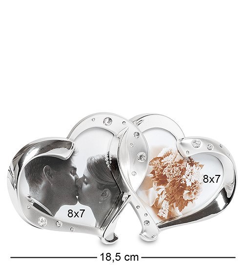 Оригинальная рамка для фото «Влюбленные сердца» выполнена в романтическом стиле. Два больших сердца мило сплетаются в единую композицию. Смотрится эффектно и интересно, особенное внимание уделяется деталям – небольшие стразы рассыпаны по основанию, линии не плоские, а слегка изогнуты, чем подчеркивается уникальность дизайна.