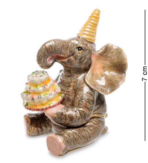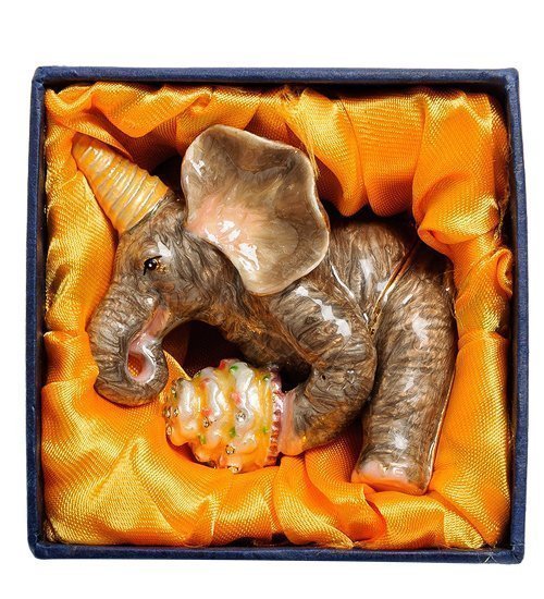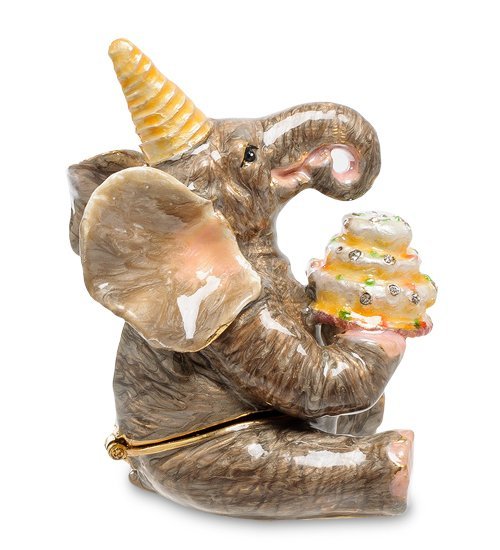 Слоник уселся, вытянул задние лапы, а в передних держит роскошный трехэтажный торт. Он должен вручить эту красоту имениннику, но, похоже, не утерпел и сам начал его пробовать. Слоник в доме – символ удачи и счастья, тем более, такой, в котором скрывается загадка.
