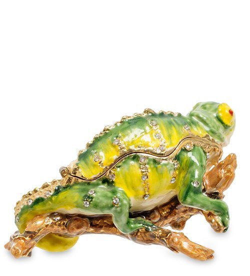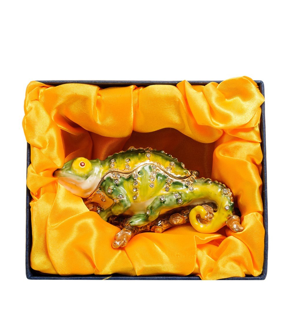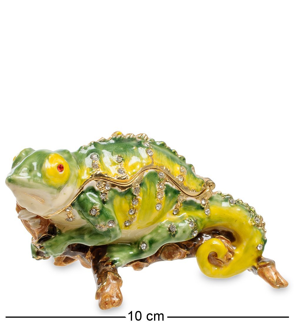 Шкура хамелеона усыпана кристалликами, изображающими капли воды. Если приподнять голову рептилии, внутри откроется пространство небольшой шкатулочки, где удобно хранить такие украшения, без которых не выйти из дому. Они и под рукой будут, и всегда сохранятся в порядке.