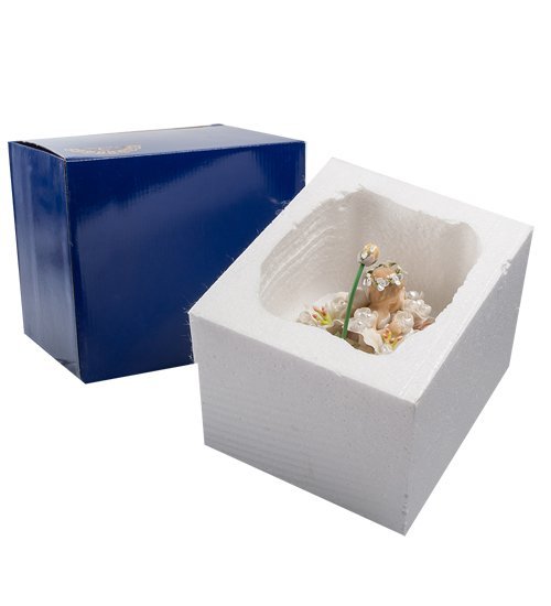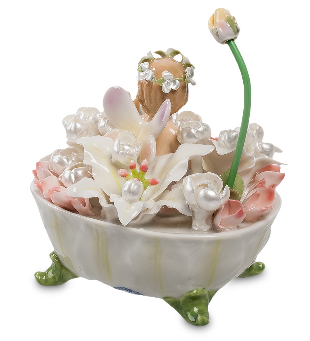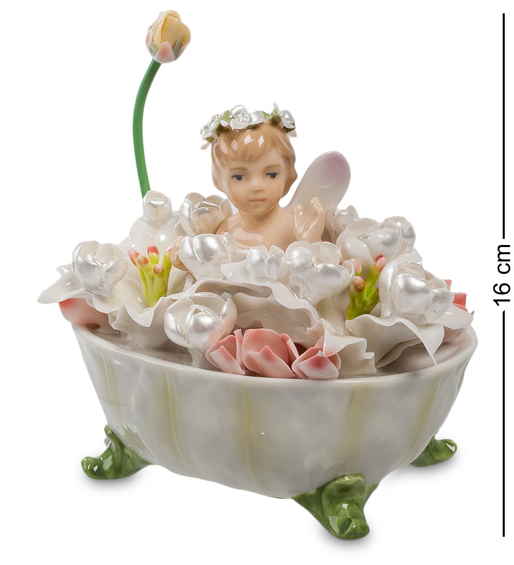 Маленькая девочка – это настоящая цветочная фея. Она купается в ванне, заполненной цветами, и на голове у нее – цветы. Даже душ имеет вид розового бутона. Красиво и нежно. Но это еще не все – композиция представляет собой музыкальную фигурку, радующую всех не только прелестным видом, но и очаровательной музыкой.