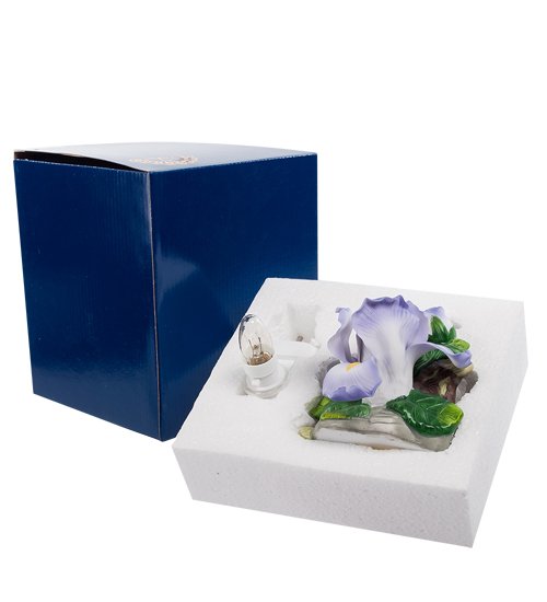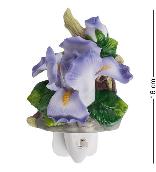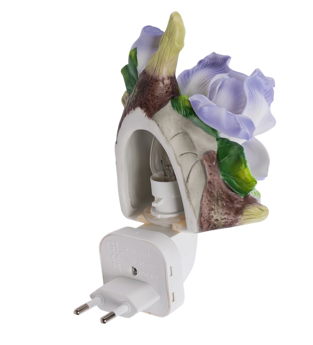 Этому светильнику не нужна подставка, не надо его и подвешивать на стену. Достаточно его просто вставить в розетку – она послужит не только источником электропитания, но и опорой. Выглядит светильник, как небольшой букет цветов, центральное место в котором занимает роскошный бледно-фиолетовый цветок ириса. Вокруг – зеленые листья, вверху – бутон нежной розы. Когда поворотом выключателя светильник оживает, каждый лепесток и зеленый листок букета начинают светиться, как будто на букет упал яркий и теплый луч летнего солнца. Очень практичный букет-светильник: и красоту в комнате создает, и ночную темноту разгоняет. В качестве ночника такой световой прибор идеален.