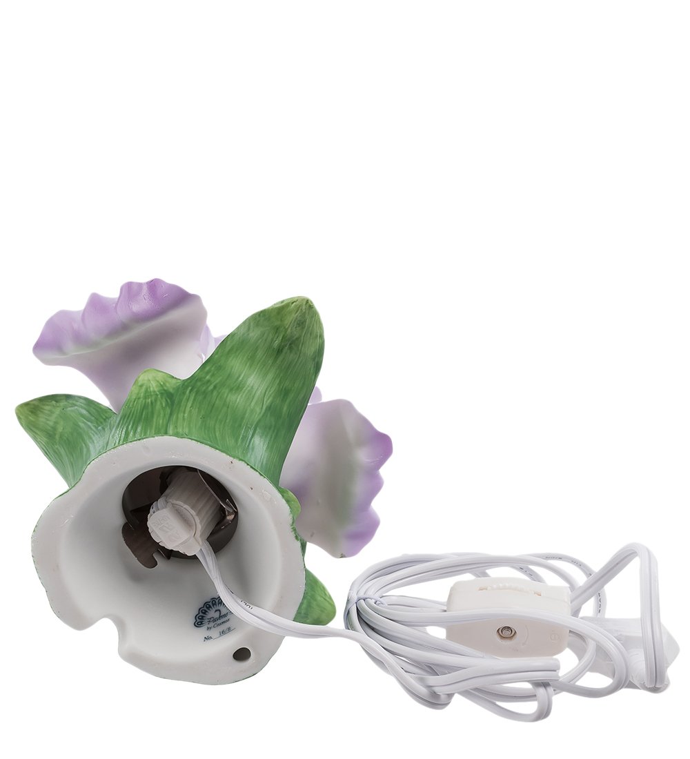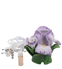 Этот светильник представляет собой роскошный цветок ириса. Основанием служат широкие зеленые листья, тонкие фарфоровые лепестки бледного сиреневого цвета просвечиваются насквозь и как бы оживают под светом лампочки, спрятанной внутри цветка. Ночью светильник своим мягким светом рассеет ночную тьму и оживит ее ароматом цветов. Да, в этом светильнике спрятан ароматизатор, и исходящий от фарфорового цветка запах вам не причудился – он действительно исходит от этого ночника. Место светильника – в спальне или в детской комнате, чтобы ночью было не страшно вставать, да и проще найти понадобившуюся вещь. Как хорошо, когда комнату освещает ночник, тем более так приятно пахнущий!