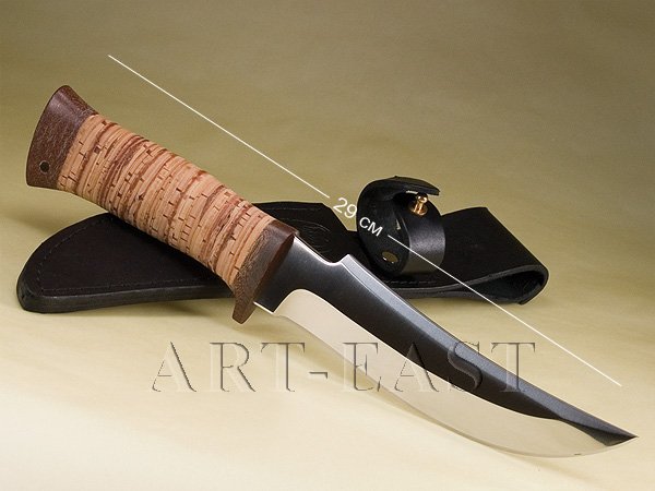 Нож "Русский-3"имеет очень солидный вид в черных кожаных ножнах, и в качестве подарка смотрится просто прекрасно. Прочное стальное лезвие и рукоять из бересты делают его надежным помощником на охоте или рыбалке, так что без дела нож лежать не будет. Подарить мужчине нож - это признать его силу, потешить его самолюбие, и просто доставить ему настоящую радость.