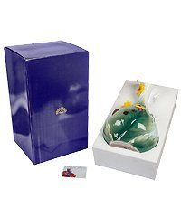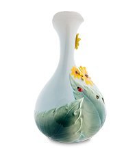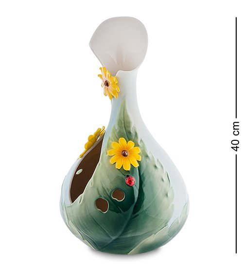 Удивительно обыграна цветочная тема при изготовлении этой уникальной вазы. Идеально подобрана цветовая гамма — ярко-желтые скромные цветы на глубоком сине-зеленом фоне. Удивителен дизайн изделия, который получился воздушным и изящным, совершено неповторимым.